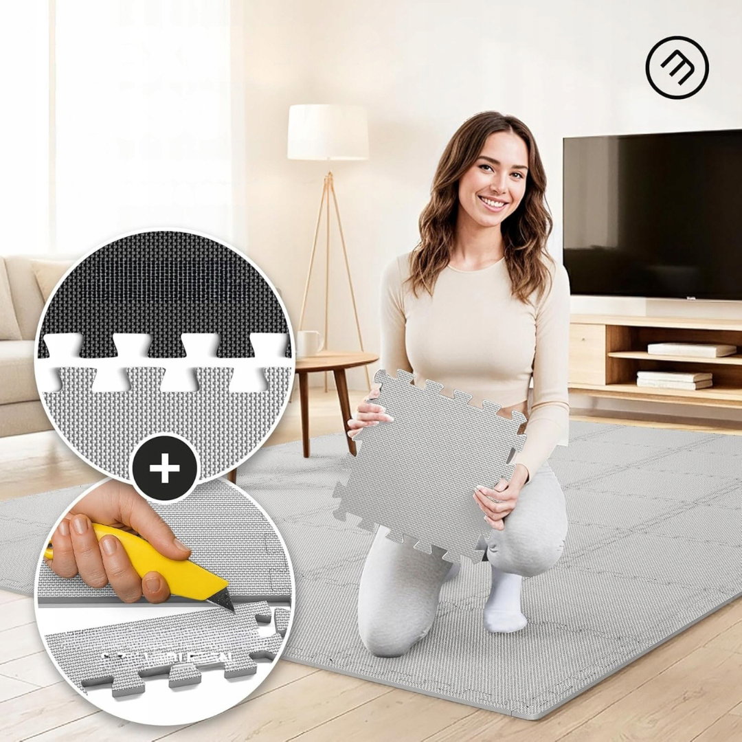 - Modułowy kształt: dzięki rozszerzalnemu kształtowi puzzli maty ochronne można łatwo przycinać, układać i dopasowywać do dowolnej powierzchni. Duże i małe elementy można swobodnie łączyć, tworząc optymalne pokrycie podłogi.