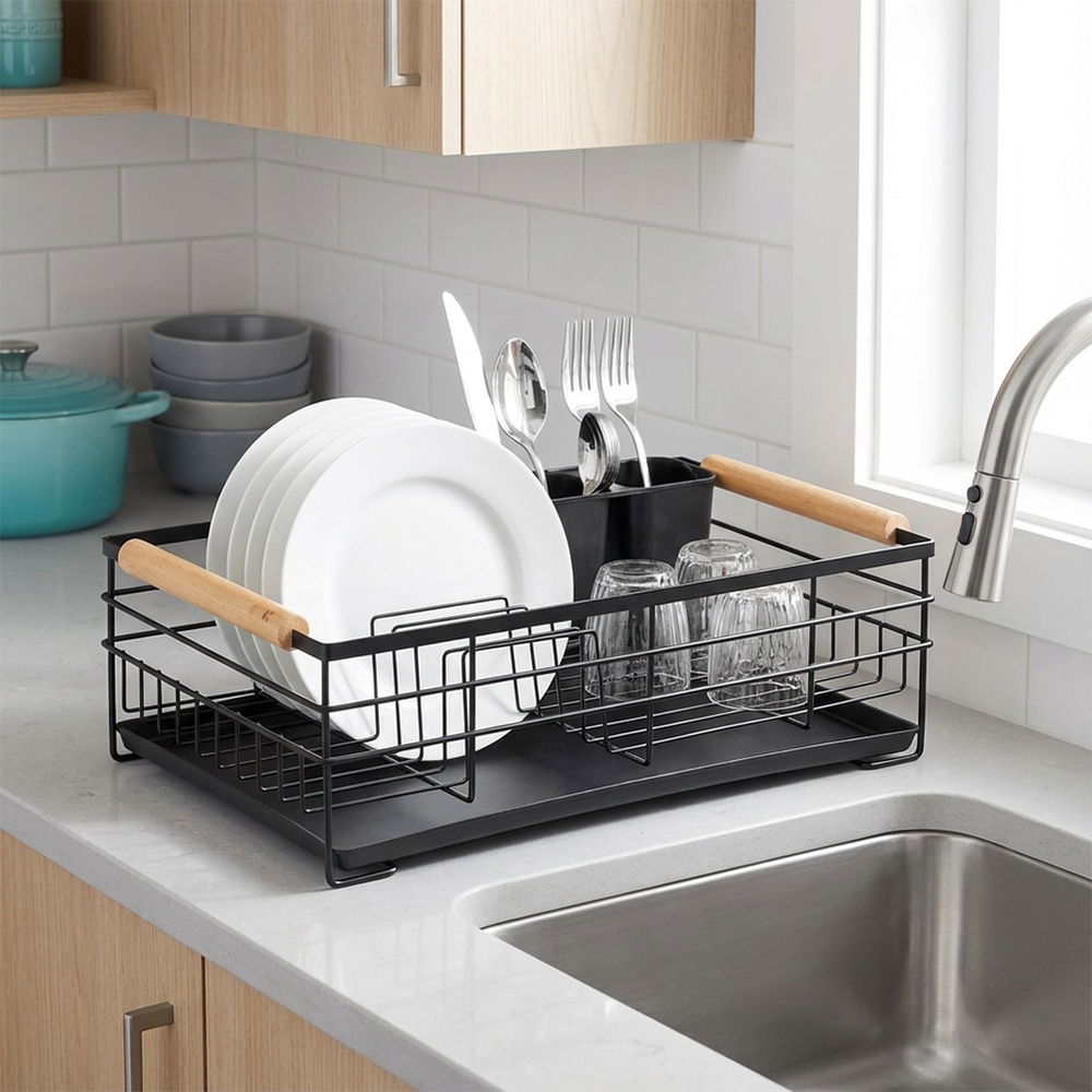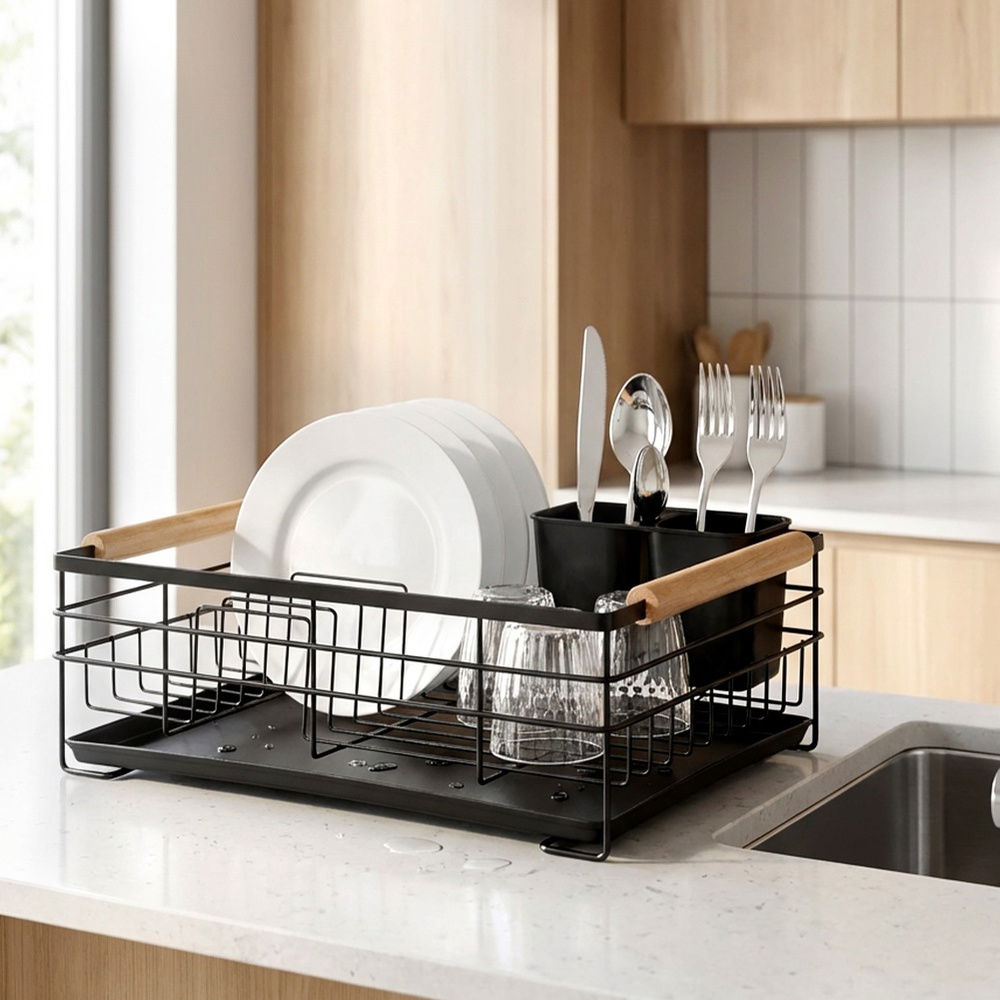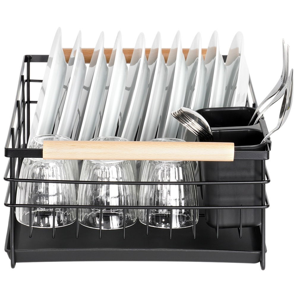Kompaktowa suszarka na naczynia z miejscem na talerze oraz sztućce. Wykonana z wytrzymałych materiałów. Dzięki niej zapomnisz o nieuporządkowanych naczyniach i mokrych śladach na blacie szafek przy zlewie. Suszarka to niezbędny element wyposażenia kuchni. Wykonana w eleganckim stylu, a zarazem funkcjonalna. Łatwa w czyszczeniu. Posiada wyjmowaną tacę ociekową, dzięki czemu utrzymanie jej w czystości nie stanowi problemu.