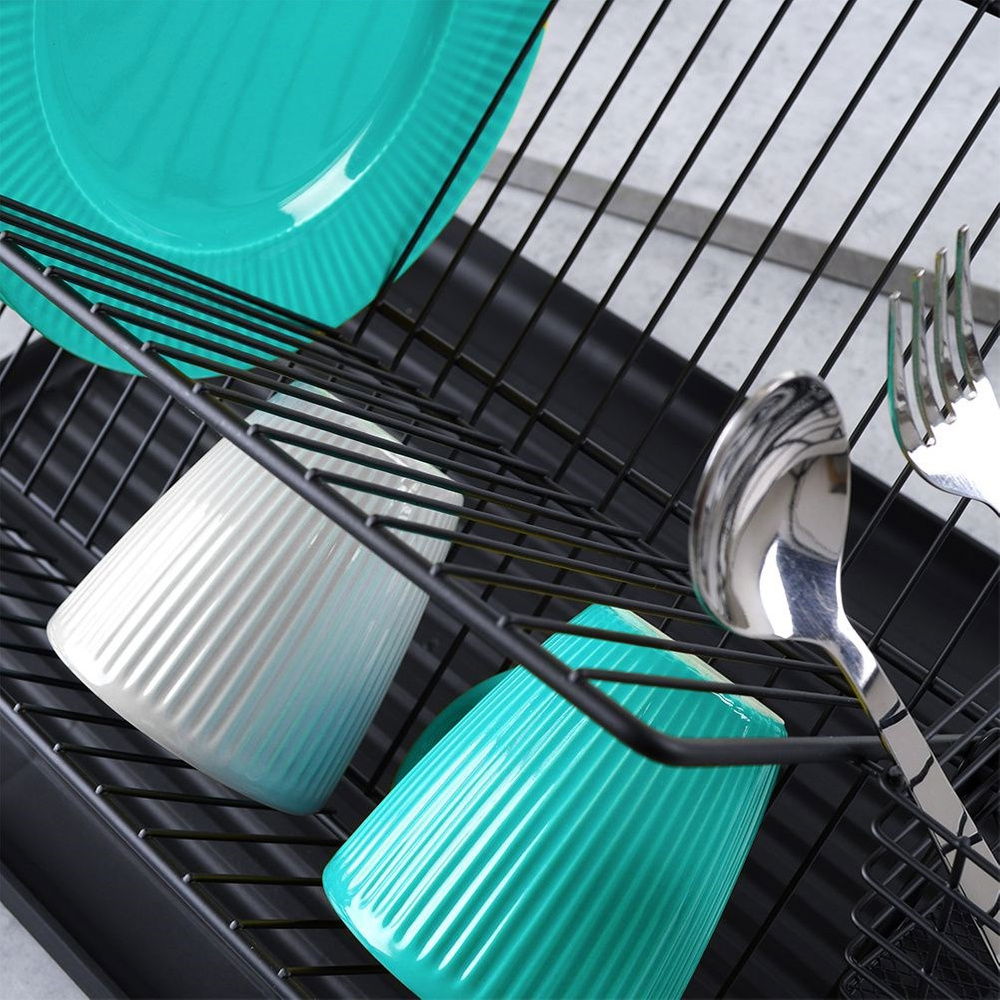 Dwupoziomowy ociekacz na naczynia o wymiarach 45 x 32 x 25,5 cm. Wykonany z metalu w kolorze czarnym. Suszarka jest niezwykle pojemna, gdyż posiada miejsce na talerze, kubki, szklanki czy miseczki. Łatwa w czyszczeniu. Niezbędny element wyposażenia kuchni. Suszarka prezentuje się niezwykle elegancko, będzie pięknie prezentowała się w każdej kuchni.