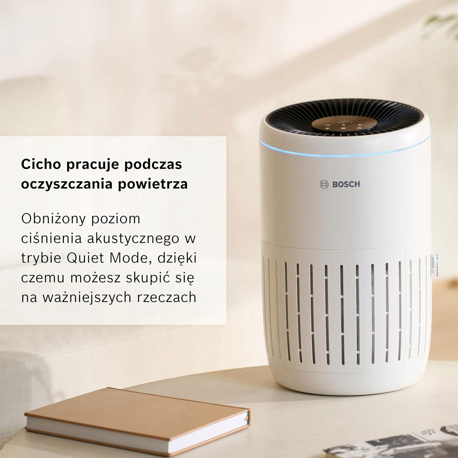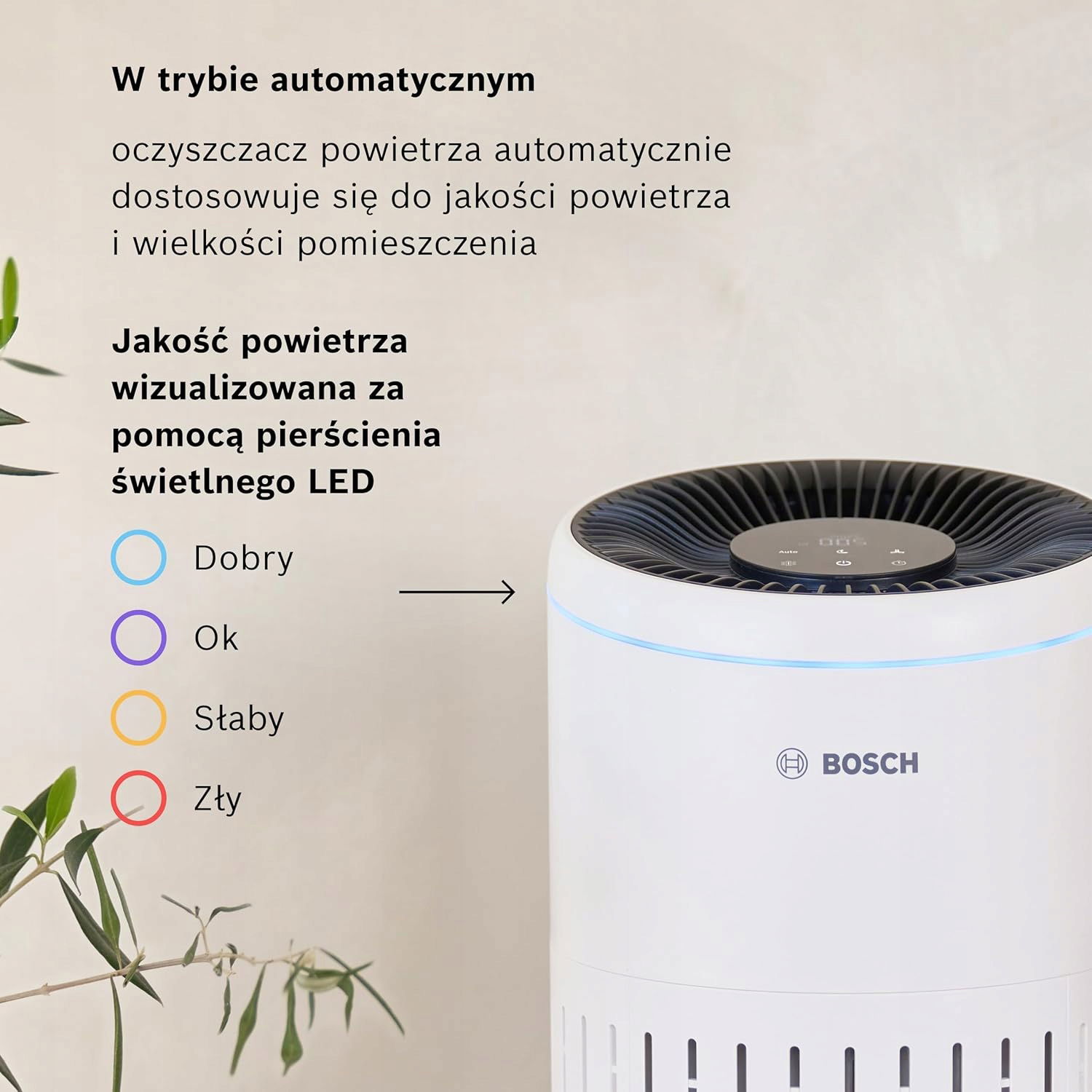 Bosch Air 2000 Oczyszczacz Powietrza - na około. 37.5 m². Usuwa 99,9% wszystkich zanieczyszczeń dzięki filtrowi powietrza HEPA13. Zawiera inteligentny czujnik, tryb uśpienia, CADR 180 m³/h