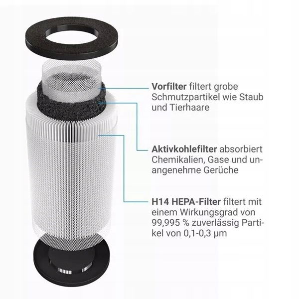 Dzięki filtrowi H14 HEPA cząsteczki o wielkości 0,1 - 0,3 μm, a tym samym najmniejsze cząstki zawieszone (aerozole) są odfiltrowywane z powietrza w pomieszczeniu.