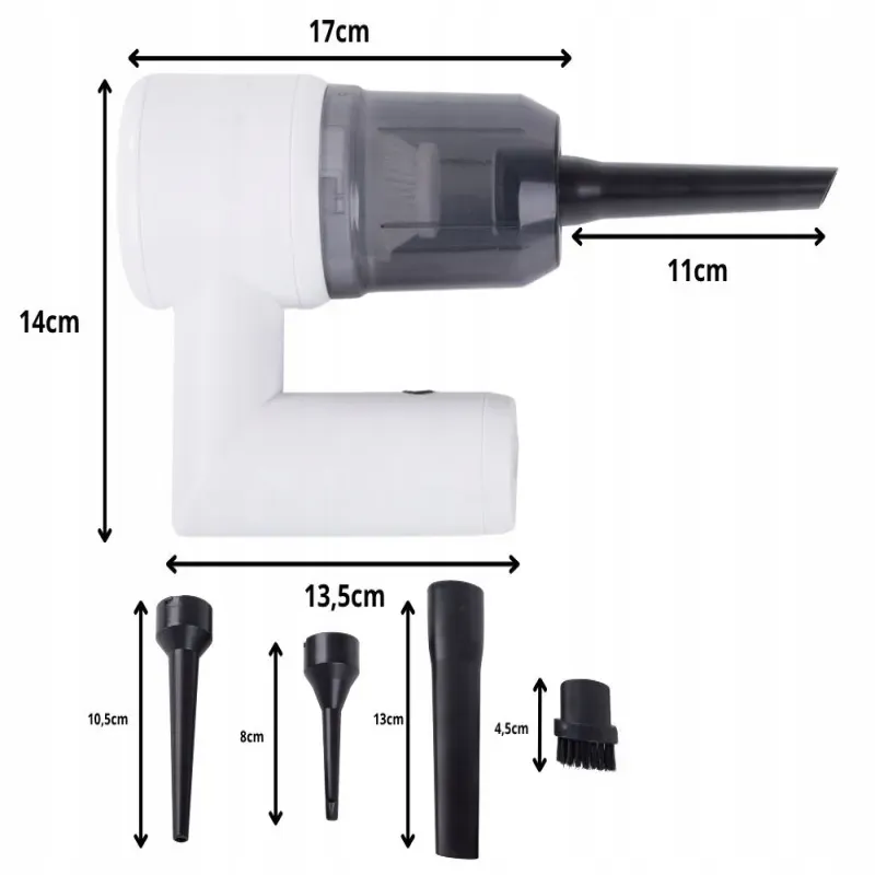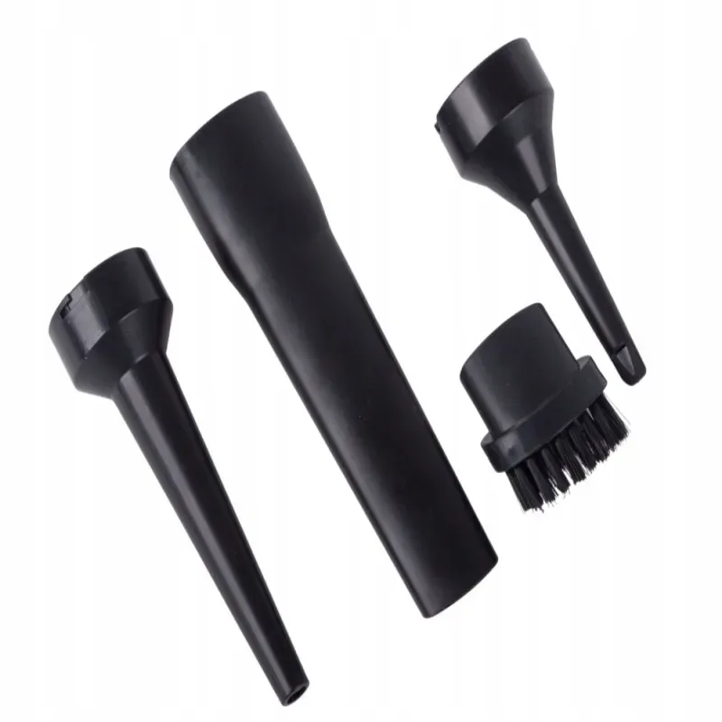 W komplecie znajduje się kilka wymiennych końcówek: szczelinowa, ze szczoteczką oraz stożkowe dysze do funkcji dmuchawy. Dzięki temu bez problemu dotrzesz w zakamarki foteli, klawiatur czy wentylacji i dokładnie je wyczyścisz.