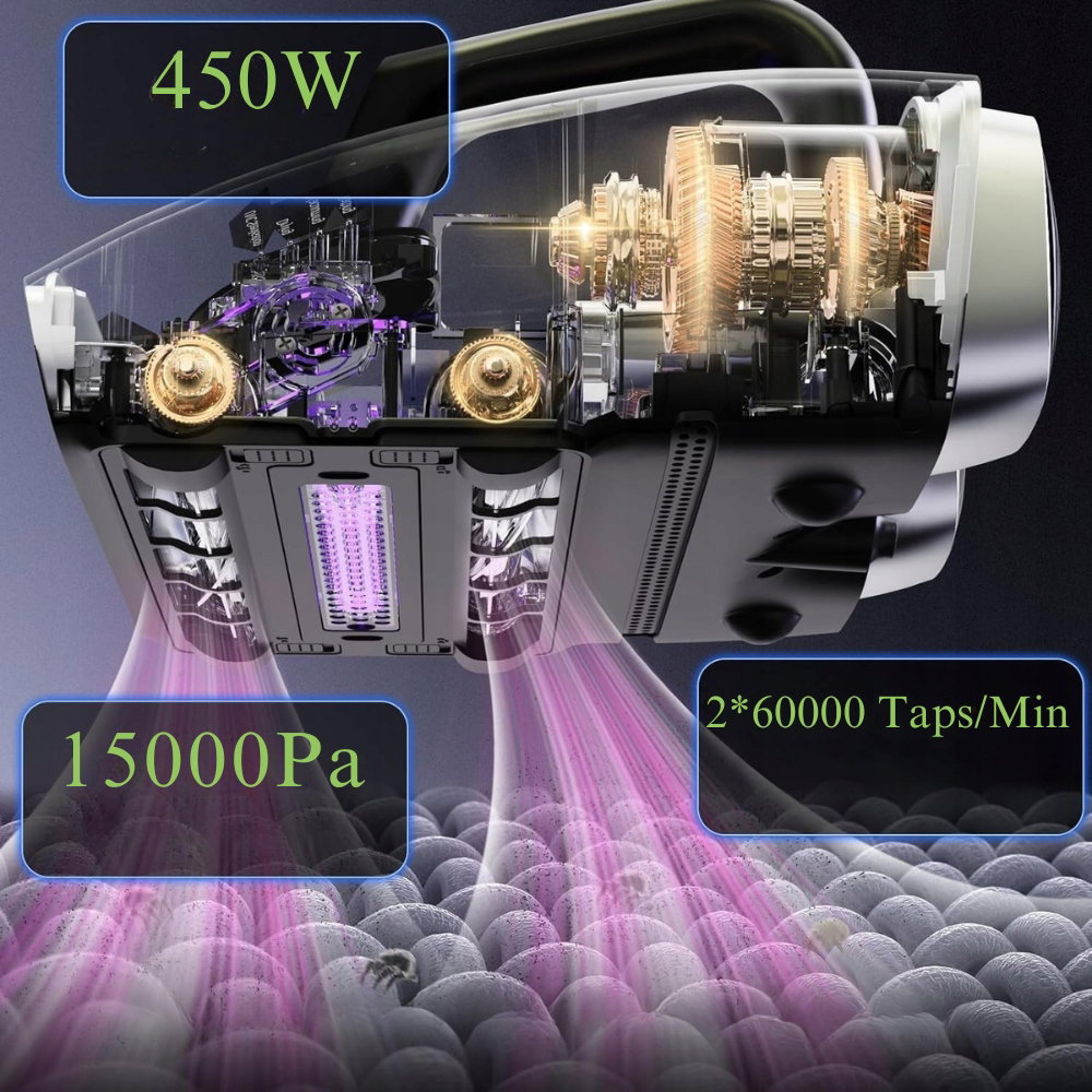 - Mocne, podwójne czyszczenie szczotkowe: podwójny system szczotek generuje 2 × 60 000 ruchów na minutę, co umożliwia skuteczne rozbijanie i usuwanie kurzu oraz sierści zwierząt z głębokich warstw pościeli i tapicerowanych mebli. Siła ssania wynosząca 15 kPa, wspierana przez silnik o mocy 450 W, zapewnia efektywne, dogłębne czyszczenie łóżek, sof i innych powierzchni, przyczyniając się do poprawy higieny i jakości otoczenia.