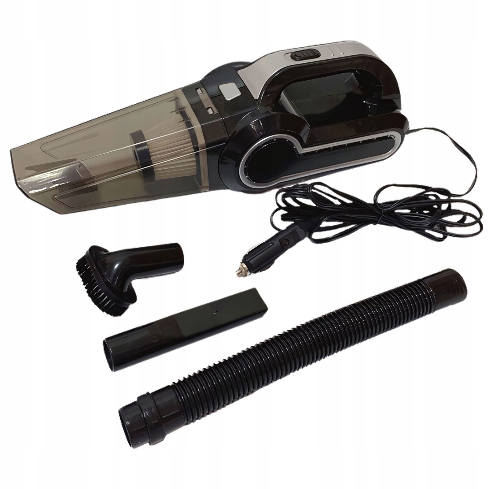 ✅ W zestawie odkurzacz posiada dwie wymienne końcówki, jedną nakładkę oraz wąż o długości 25 cm więc odkurzysz nim wszystkie zakamarki samochodu.