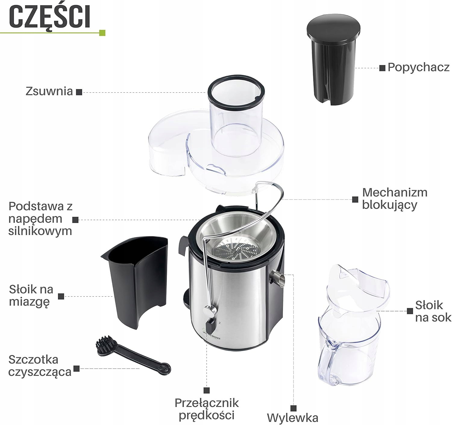 - Sokowirówka została zaprojektowana w sposób umożliwiający łatwe demontowanie części do czyszczenia.