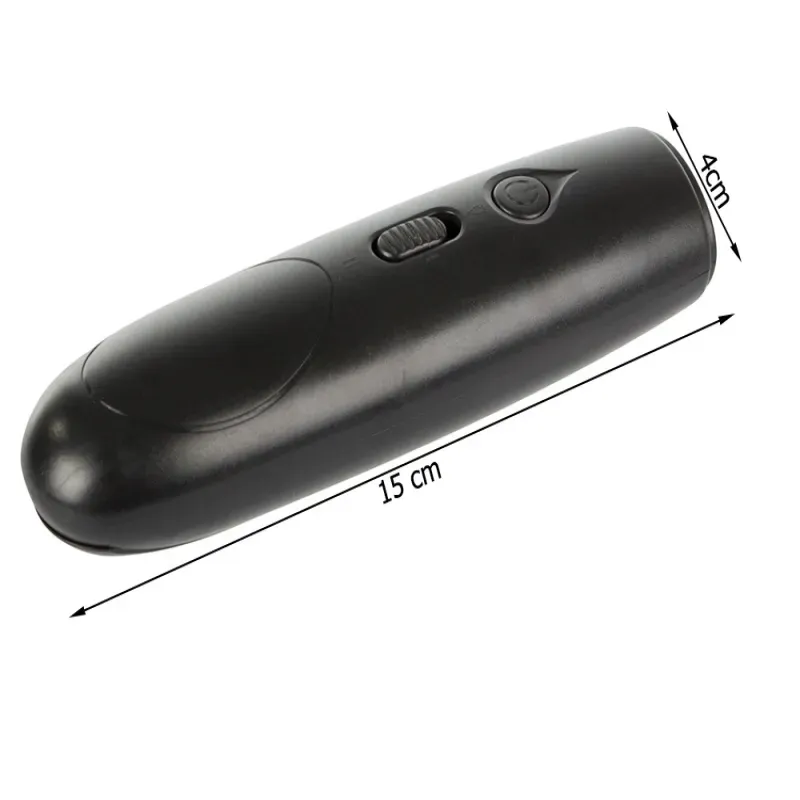 Urządzenie dla psów służące do uspokojenia uporczywego szczekania. Wytwarza mocny sygnał ultradźwiękowy, niesłyszalny dla ludzkiego ucha, ale irytujący i uporczywy dla psów. Podczas włączenia urządzenia automatycznie zapalają się dwie boczne lampki.
