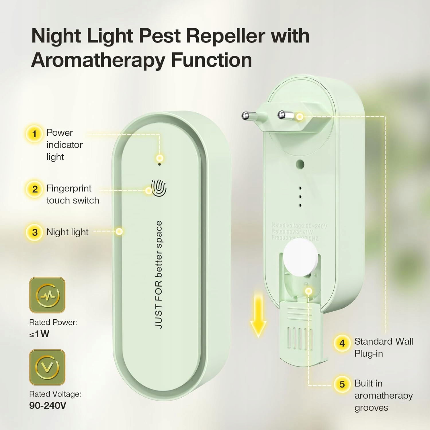 Urządzenie wyposażone jest w funkcję ciepłego światła nocnego i aromaterapię, co dodatkowo podnosi komfort użytkowania. Możesz dodać swój ulubiony zapach do zestawu 8 tabletek.