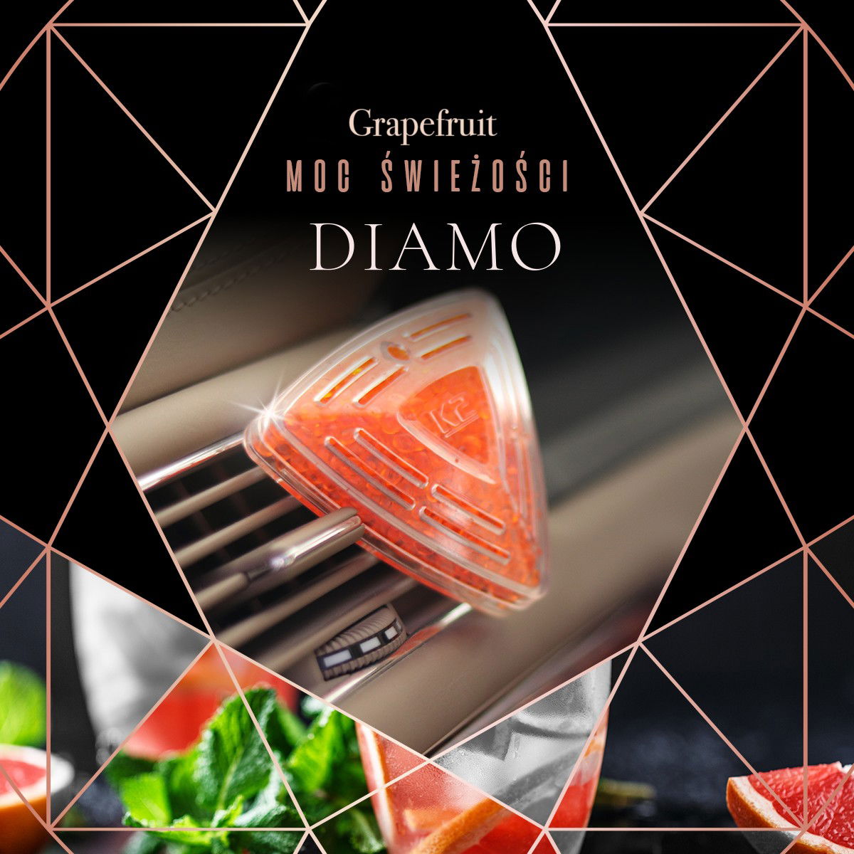 K2 DIAMO GRAPEFRUIT - Potężne uderzenie świeżości wgniecie Cię w fotel, niemalże jak podczas startu super samochodu. Nieokiełznana i dzika moc cytrusów pobudzi i orzeźwi zmysły, zabierając Cię w drogę pełną komfortu i przyjemności. Zapach uwalniany z odświeżacza K2 Diamo to wstęp do dojrzewającej w letnim słońcu przygody, której jesteś głównym bohaterem.