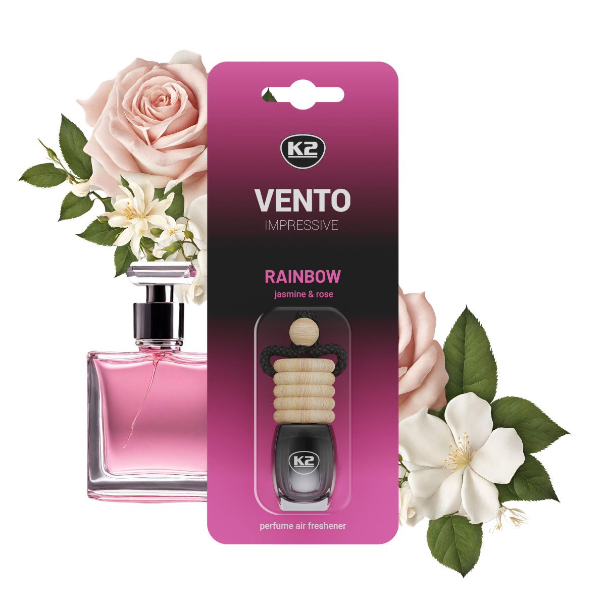 Perfumowane kompozycje zapachowe K2 Vento Impressive błyszczą zapachem niczym samochodowa biżuteria, a odświeżacz zdobi wnętrze auta.
