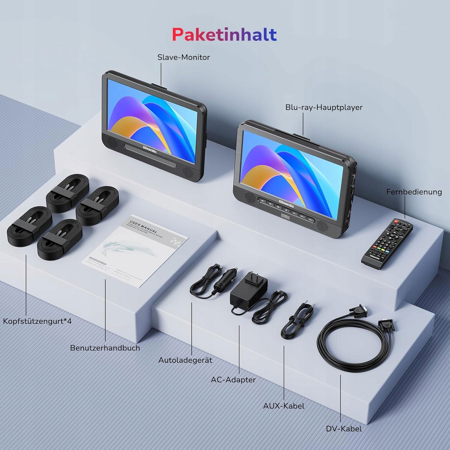 ✅ Dołączone komponenty: 2 samochodowe odtwarzacze DVD Blu Ray (1 samochodowy odtwarzacz DVD + 1 monitor samochodowy), 1 ładowarka samochodowa, 1 pilot zdalnego sterowania, 1 kabel DV, 1 kabel AUX, 1 adapter AC, 4 pasy na zagłówek, 1 instrukcja obsługi
