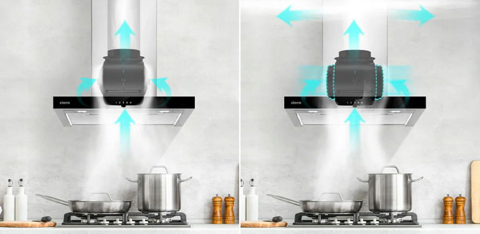 Możesz wybierać między trybem recyrkulacji a trybem wyciągu. Tryb Recyrkulacji: Recyrkulacja z CBCF004-OW (w zestawie), musisz zainstalować filtr węglowy do recyrkulacji. Zapachy i wonie mogą być filtrowane i wentylowane przez górny otwór wentylacyjny, a rura wydechowa nie jest wymagana. Tryb Wyciągu: Możesz zainstalować aluminiową rurę wydechową o długości 1,5 m i średnicy 150 mm, która jest dołączona do zestawu montażowego.