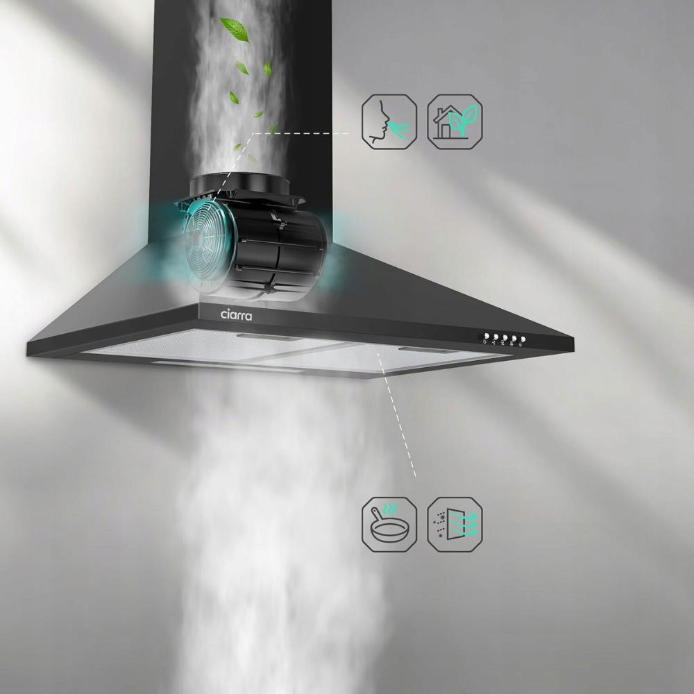 Oferując elegancki, czarny kolor i nowoczesny, piramidalny kształt, CIARRA CBCB6201 nie tylko skutecznie działa, ale także dodaje stylu każdej kuchni. Wykonany ze stali nierdzewnej, jest zarówno trwały, jak i łatwy do czyszczenia. Jego kompaktowe wymiary sprawiają, że jest idealny do montażu nad standardową płytą kuchenną, optymalizując przestrzeń i funkcjonalność w kuchni.