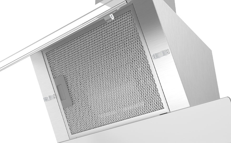 Okap kuchenny ma zdejmowany 5-warstwowy aluminiowy filtr przeciwtłuszczowy, który skutecznie wychwytuje tłuszcz i wilgoć z obszaru gotowania. Dzięki aluminiowemu filtrowi przeciwtłuszczowemu, okap kuchenny może zmaksymalizować moc wyciągu i skuteczniej usuwać dym, parę i tłuszcz.