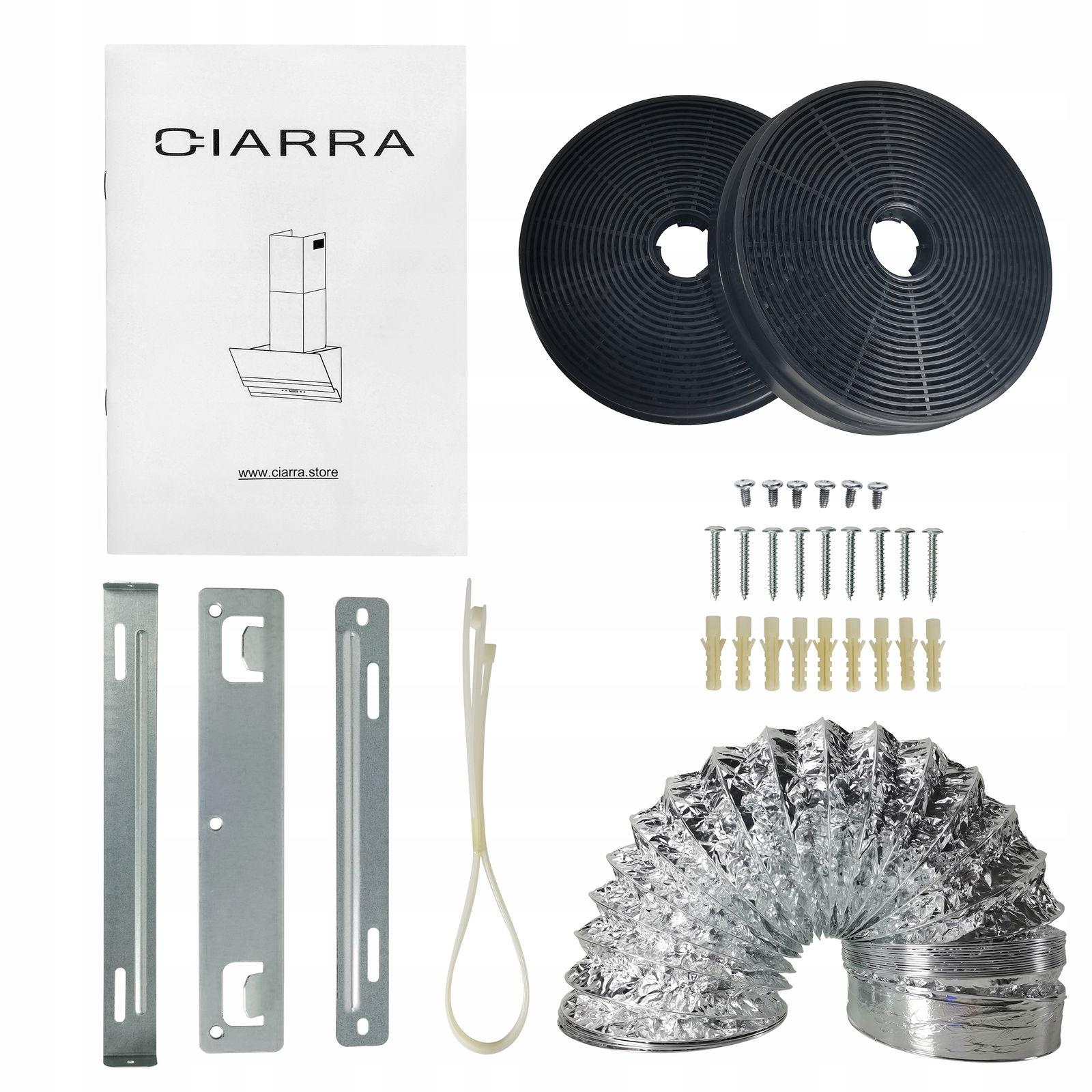 Do odciągu można zainstalować aluminiową rurę wydechową o długości 1,5 mi średnicy 150 mm, która znajduje się w zestawie montażowym.