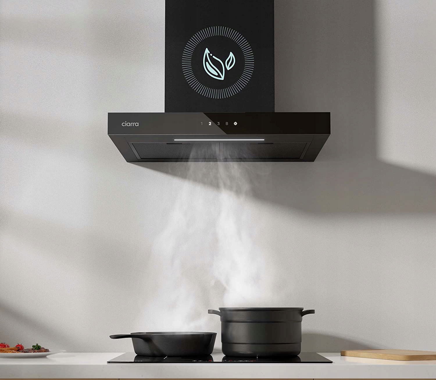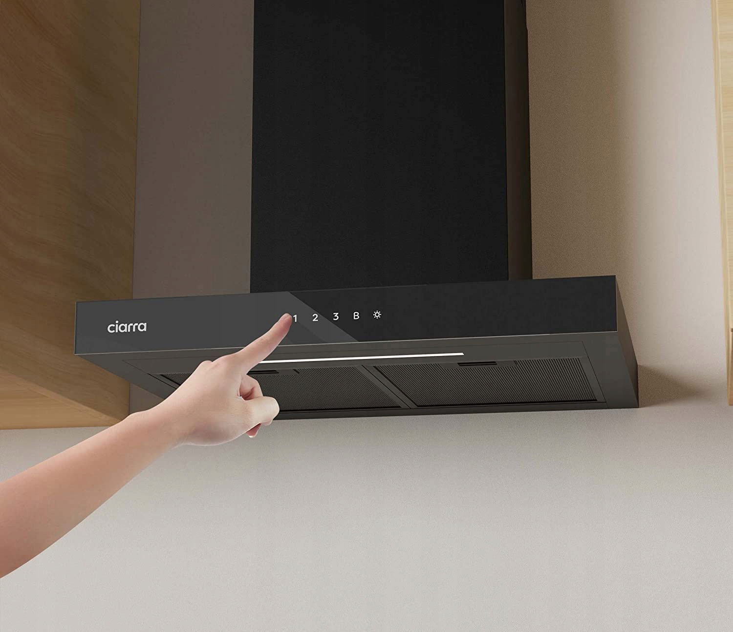 Nowoczesny wygląd: okap kuchenny z bogatym czarnym szklanym frontem z dotykowym sterowaniem i cyfrowym wyświetlaczem upiększy Twoją kuchnię nowoczesny i stylowy element przyciągający wzrok oraz sprawia, że kwadratowy szklany front jest łatwy do czyszczenia