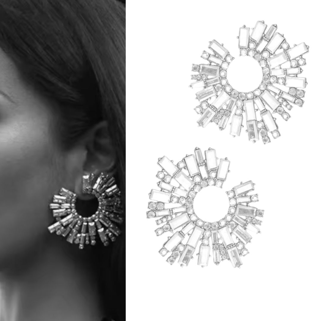 Bardzo efektowne i niesamowicie eleganckie srebrne kolczyki na planie koła z cyrkoniami ułożonymi promieniście. Stylowy i modny dodatek do każdej eleganckiej sukni czy garnituru.