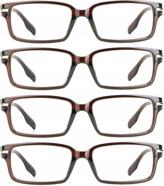 4 pary okularów do czytania w prostokątnych oprawkach typu unisex, w zestawie sznurek umożliwiający zawieszenie okularów na szyi, aby zapobiec ich zgubieniu.
