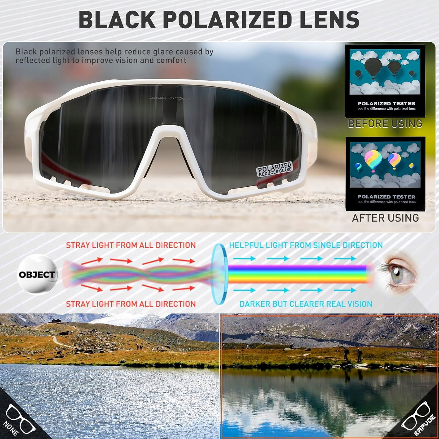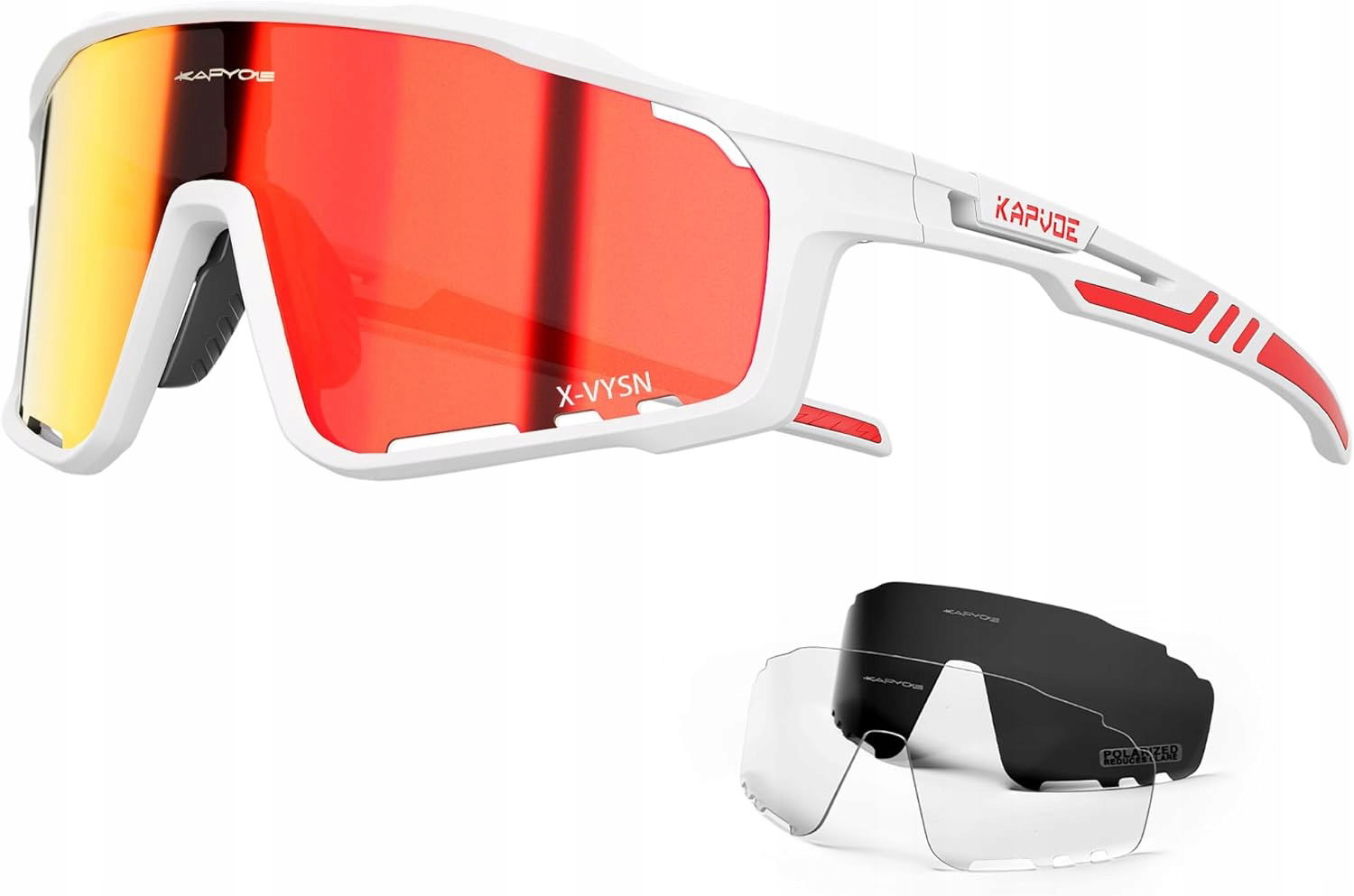 Okulary rowerowe KAPVOE oferują 3 wymienne soczewki, w tym polaryzacyjne, aby zwiększyć komfort i widoczność. Technologia KAPVOE poprawia kontrast i redukuje odblaski, chroniąc oczy przed promieniowaniem UV.