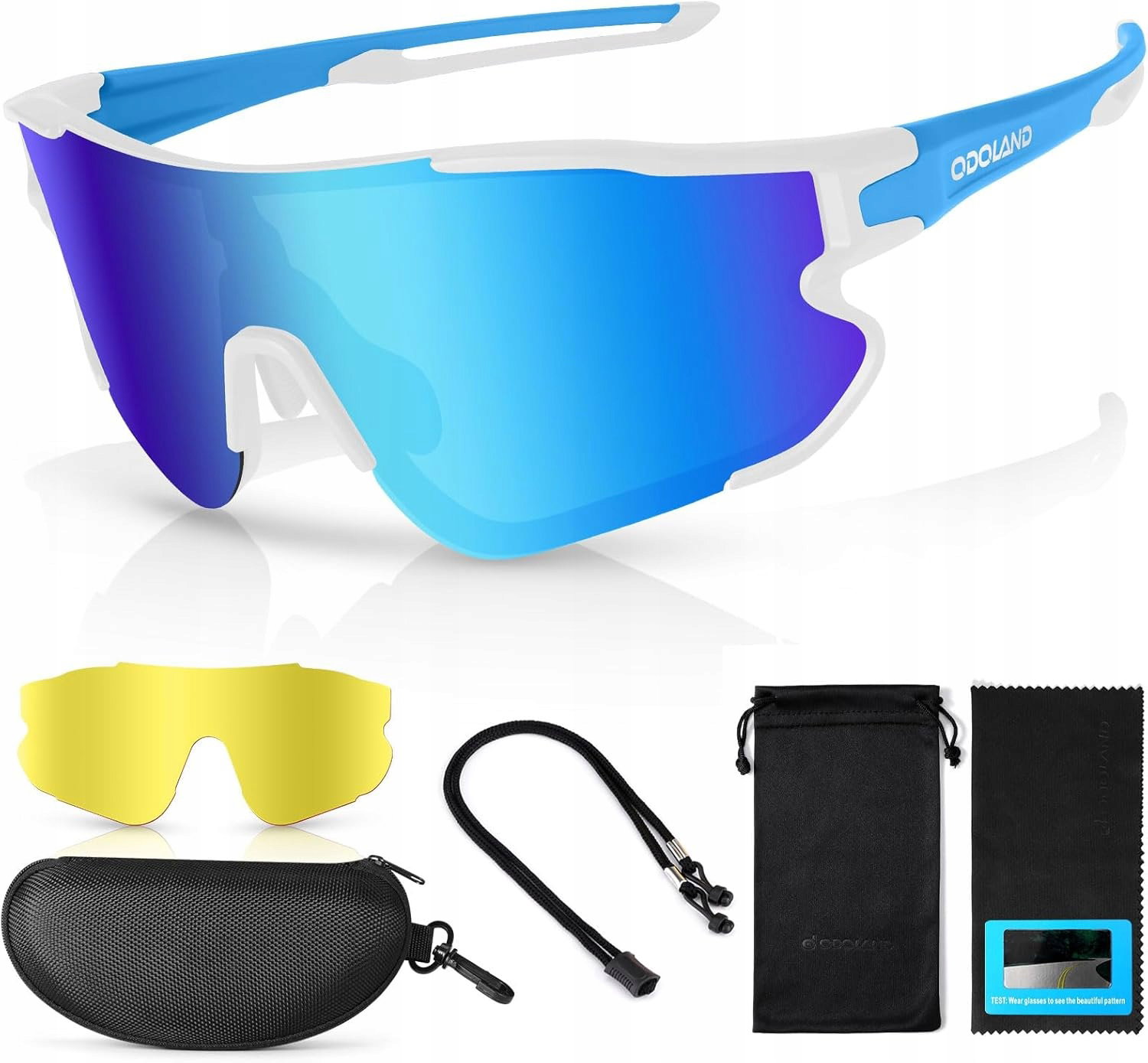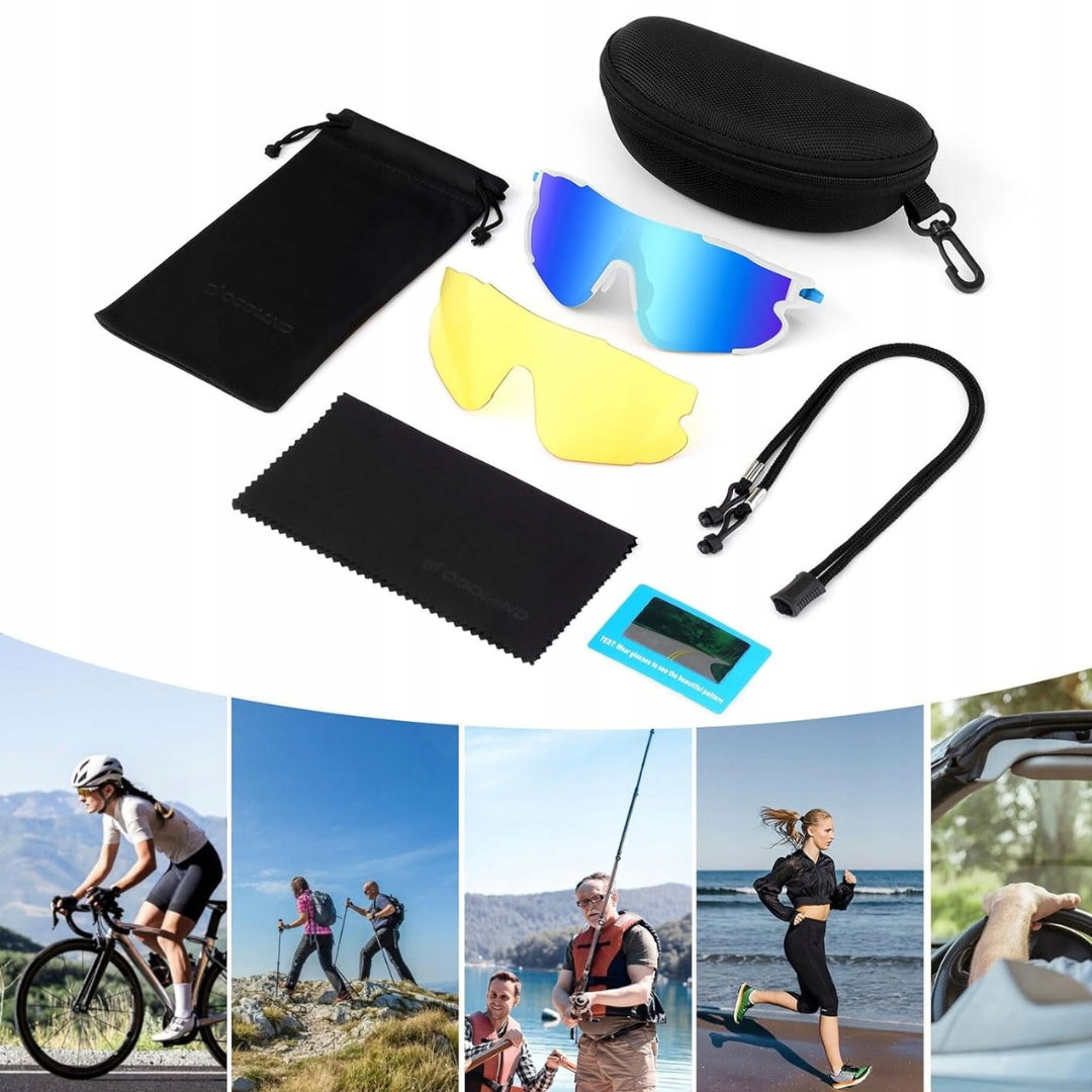 - Wielofunkcyjne akcesoria: w zestawie etui i woreczek do przechowywania i transportu okularów, miękka ściereczka do czyszczenia, dwie soczewki do szybkiej zmiany i regulowany pasek.