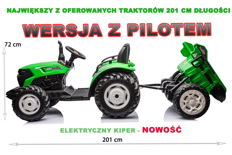 MEGA TRAKTOR Z PRZYCZEPĄ I ELEKTRYCZNYM KIPREM 24V z całą pewności zainteresuje młodego wielbiciela traktorów. Jest to największy z oferowanych pprzez nas traktorów - zały zestaw ma 201 cm długości.