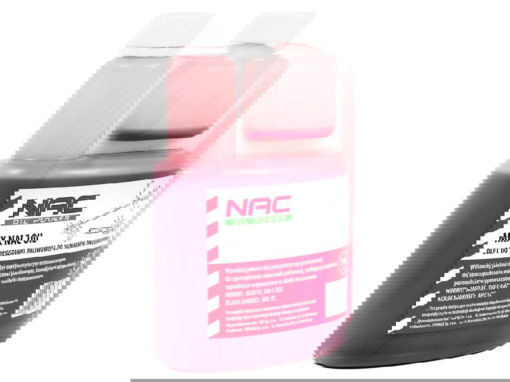 Olej NAC MIX to najwyższej klasy półsyntetyczny olej silnikowy, przeznaczony do sporządzania mieszanek paliwowych stosowanych do zasilania silników dwusuwowych w urządzeniach ogrodniczych takich jak: kosy i podkaszarki, pilarki spalinowe, odkurzacze ogrodowe, opryskiwacze czyli wszędzie tam gdzie zastosowano silnik dwusuwowy.