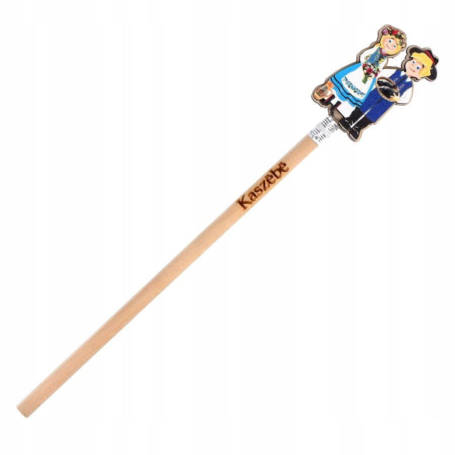 Ołówek posiada nadruk cyfrowy przedstawiający uroczą kaszubską parę oraz delikatny grawer z napisem "Kaszebe", co nadaje mu autentycznego uroku.