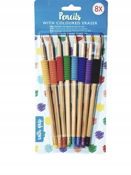 Kupujesz zestaw 8 ołówków z kolorowymi gumkami i nakładką antypoślizgową.