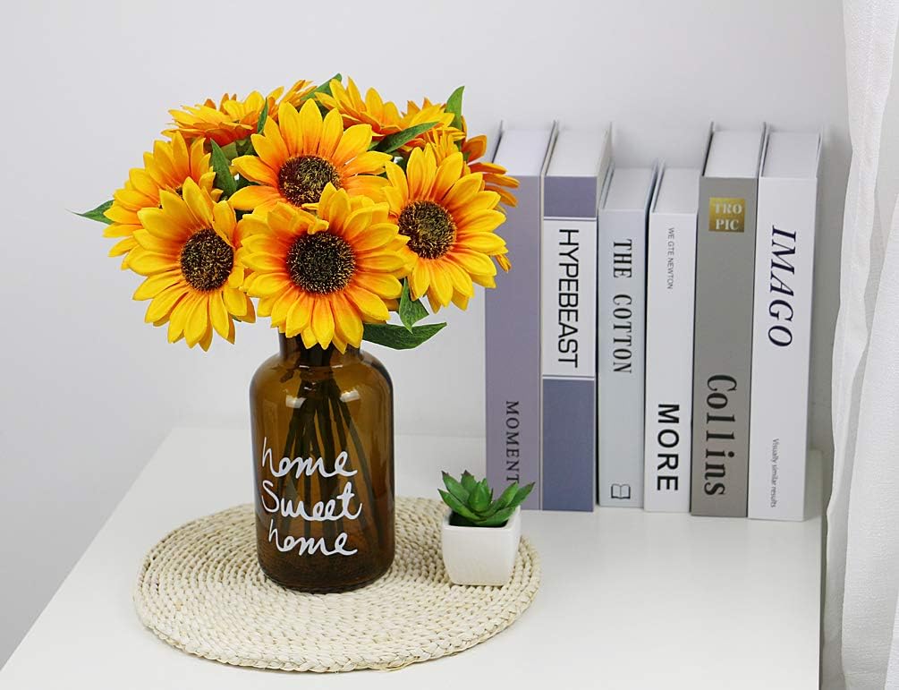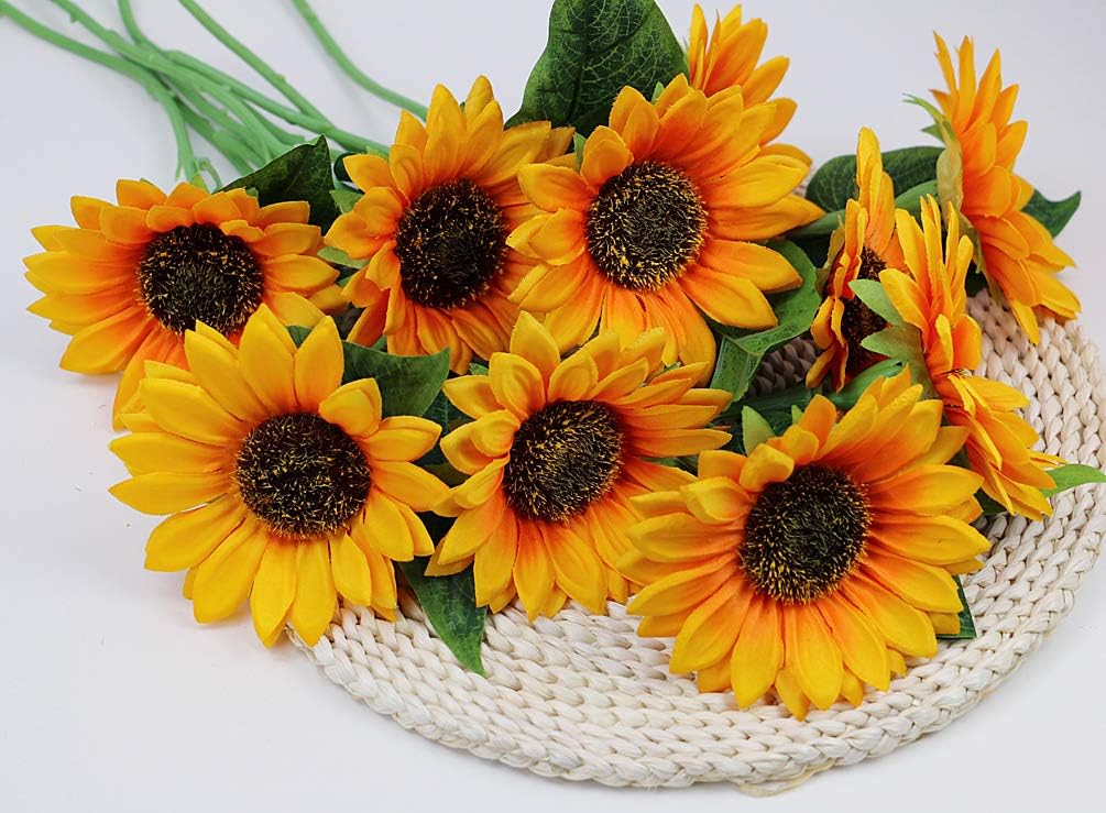 Wygląda jak żywy: Każda łodyga to w pełni kwitnący słonecznik o naturalnym wyglądzie, z 1 realistycznym zielonym liściem. Na każdym kwiatku znajdują się 32 sztuki wytłaczanych płatków, 16 płatków na 16 płatków, podwójna warstwa na każdym kwiatku, żywy kolor od żółtego do pomarańczowego rozjaśni każde pomieszczenie, jasne i żywe przez lata.