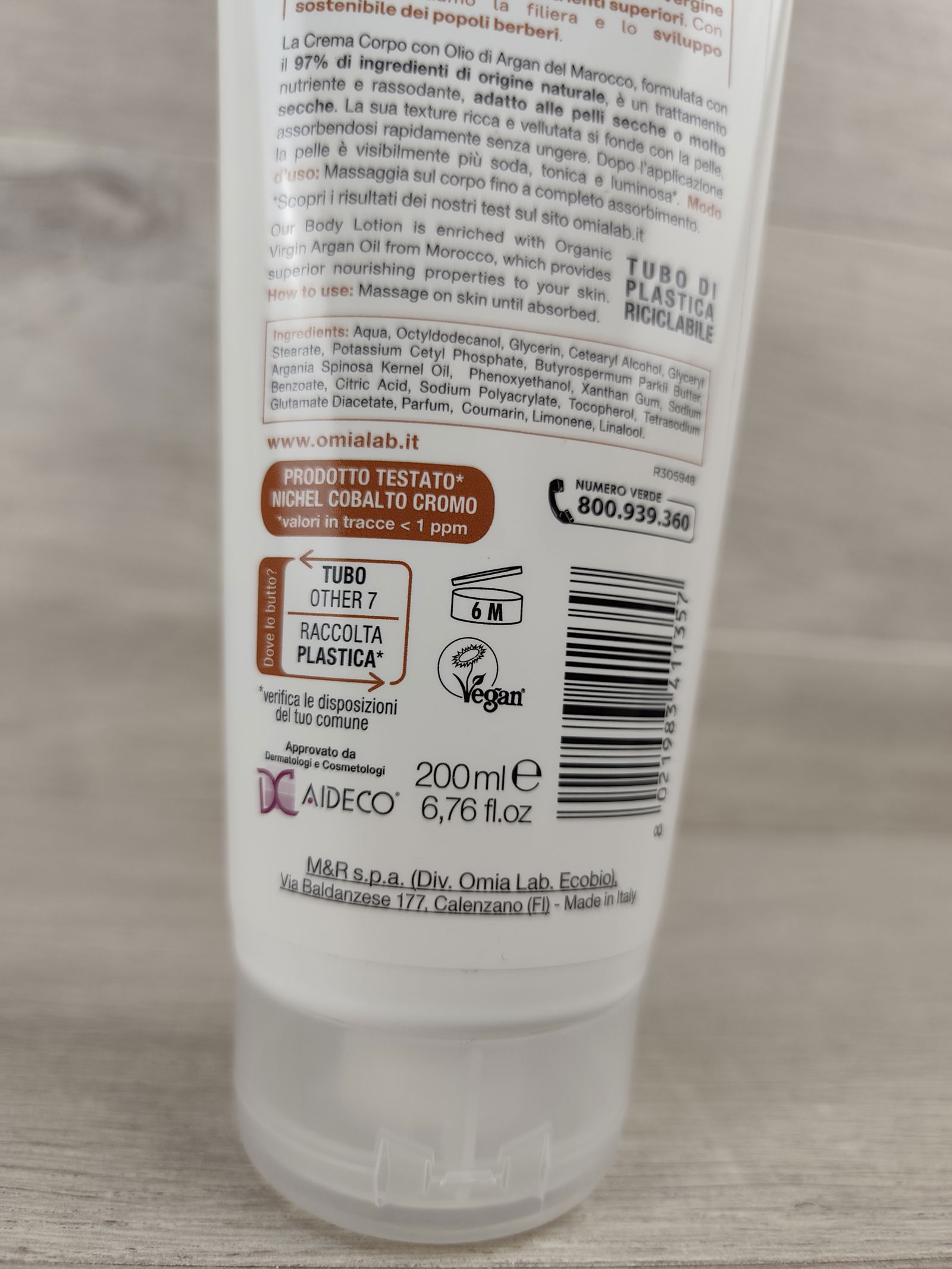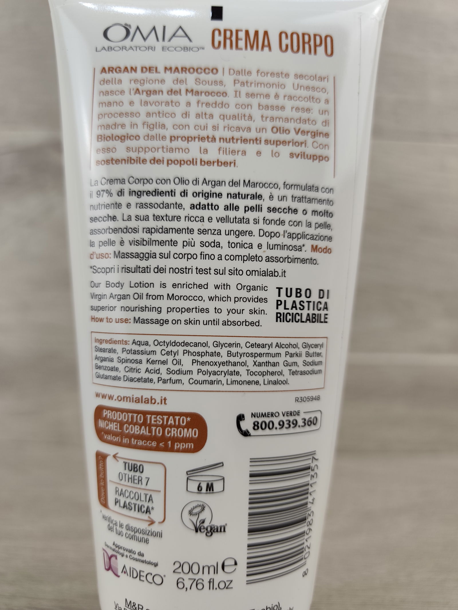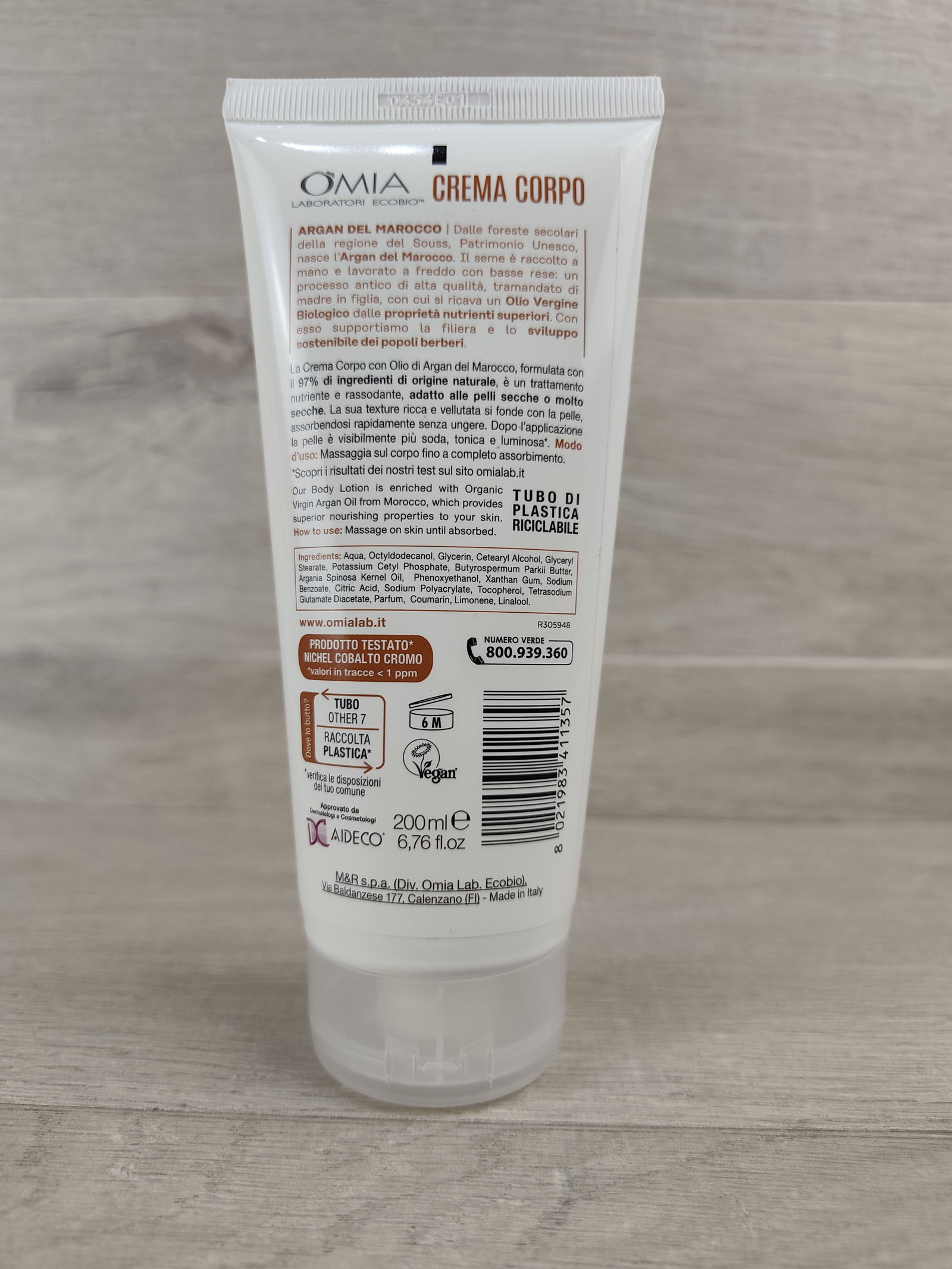 🌿 Omia EcoBio Crema Corpo Olio di Argan 200 ml to naturalny, odżywczy krem do ciała stworzony z myślą o skórze suchej i bardzo suchej. Zawiera olej arganowy z Maroka, znany ze swoich właściwości regenerujących, wygładzających i intensywnie nawilżających.