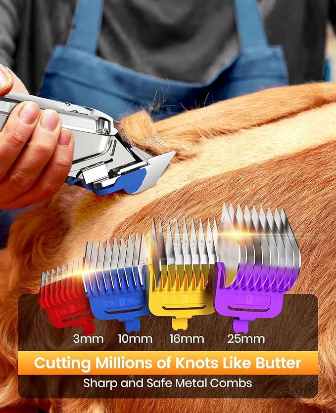 - Precyzyjne obcinacze do pielęgnacji psów: metalowy grzebień prowadzący pomaga właścicielom zwierząt domowych i profesjonalnym groomerom osiągnąć precyzyjną kontrolę nad długością cięcia, zapewniając równomiernie przyciętą sierść. Ostre i bezpieczne ostrze ze stali nierdzewnej charakteryzuje się wyjątkową mocą cięcia, dzięki czemu nawet najbardziej uporczywe plątaniny ślizgają się bez wysiłku jak masło