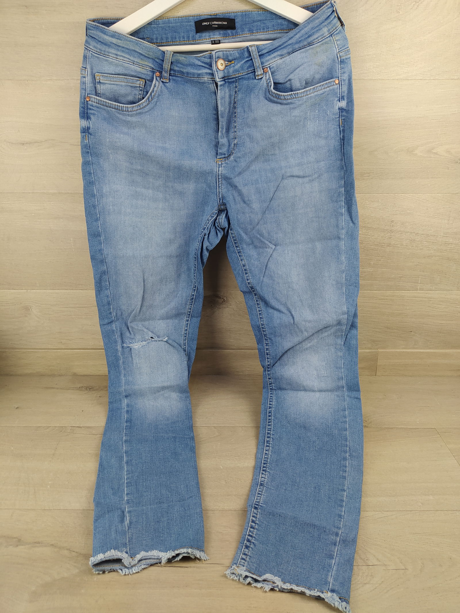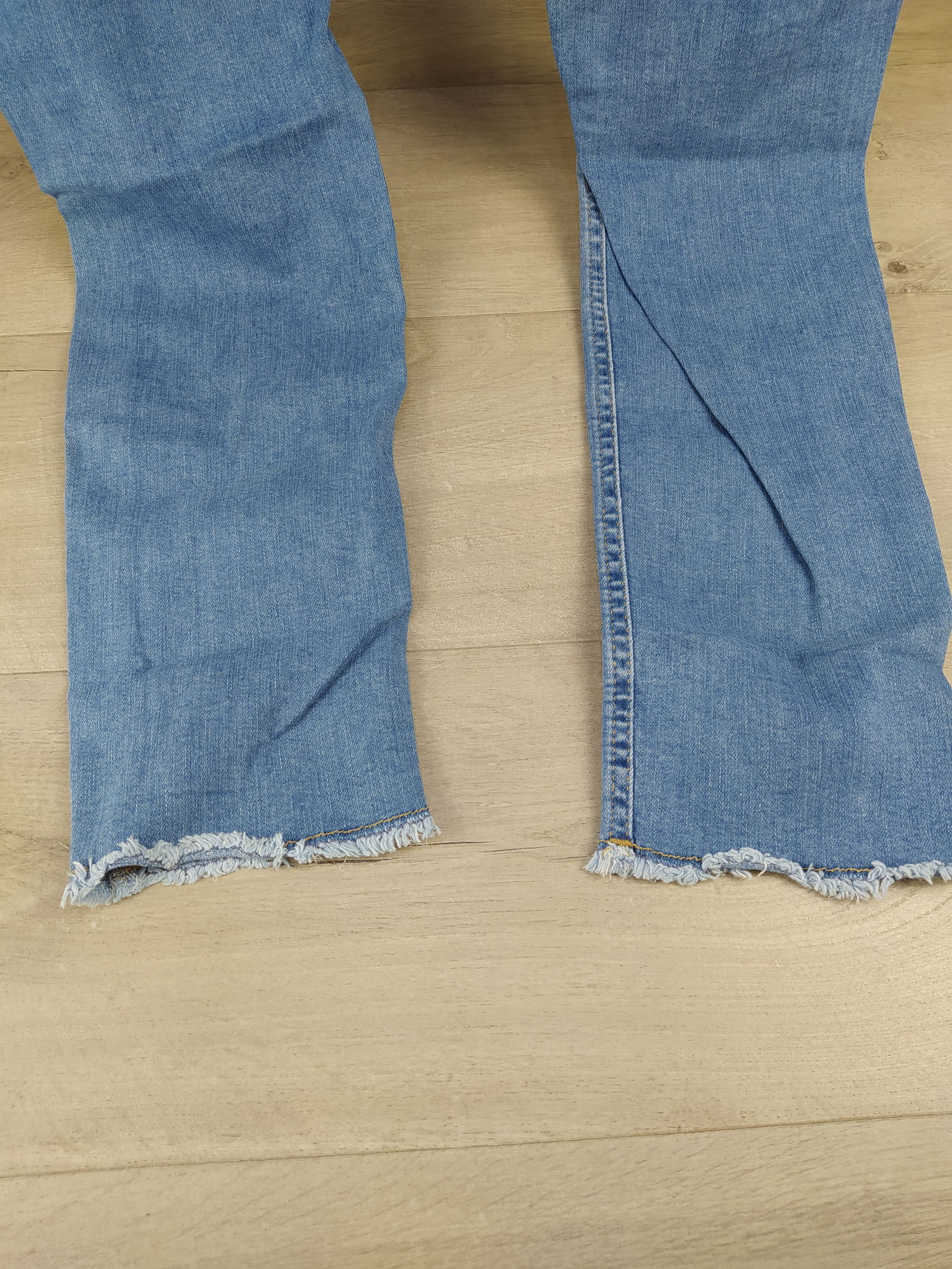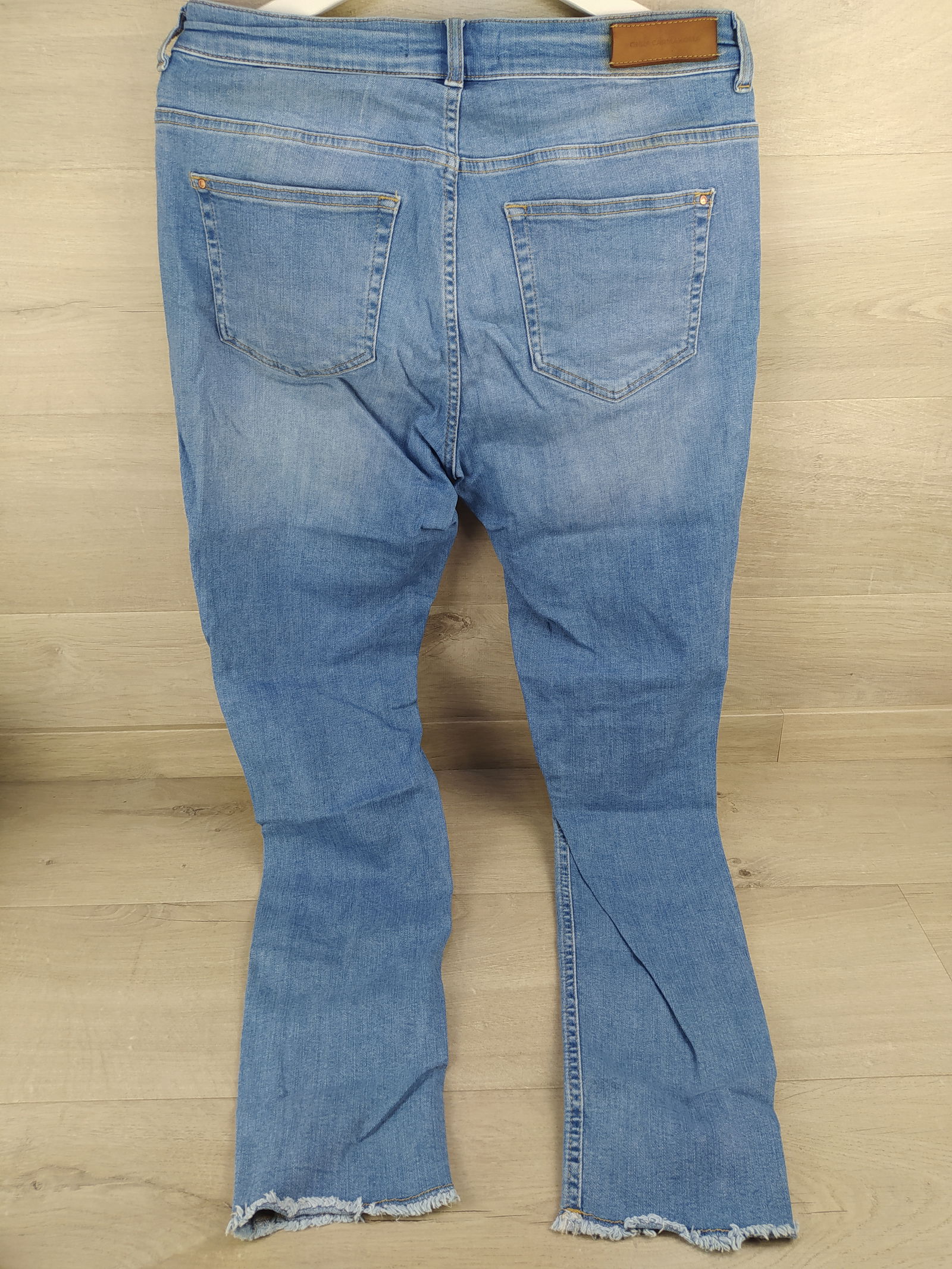 - Jeansy skinny-fit, średnia talia, skrócona długość nogawek, frędzle obszycie, faded-look, curvy size