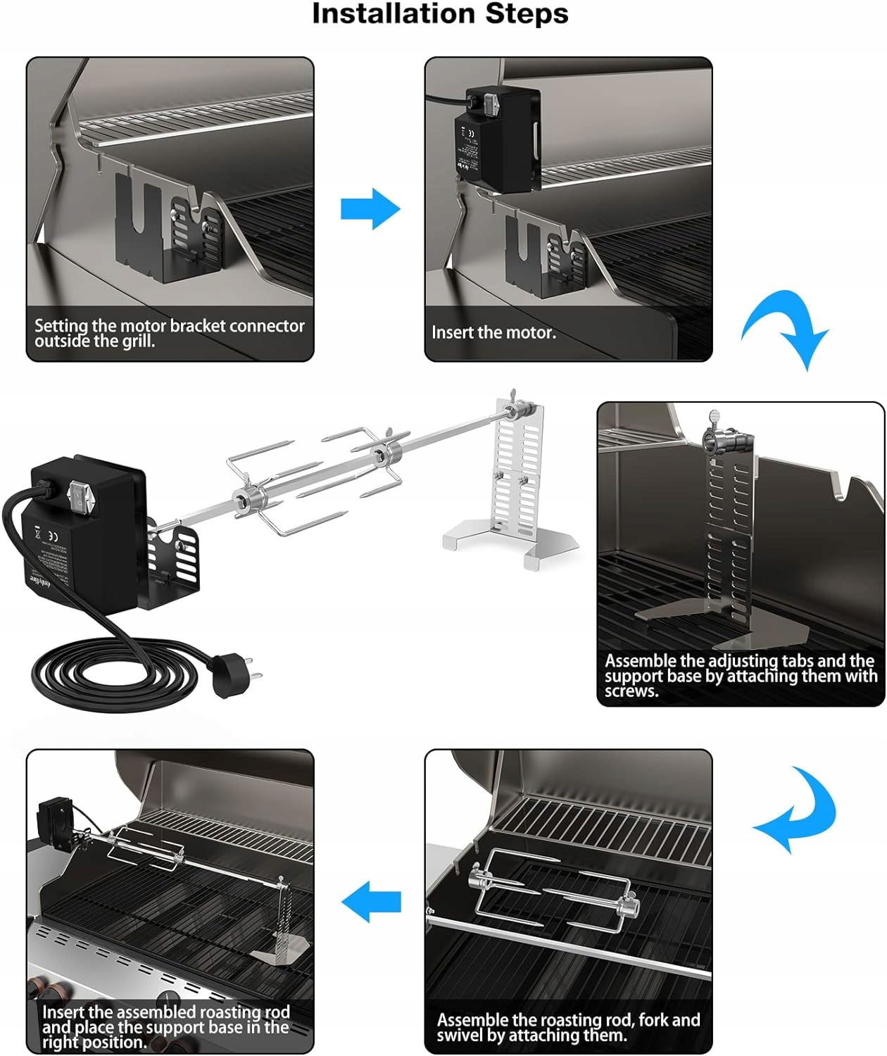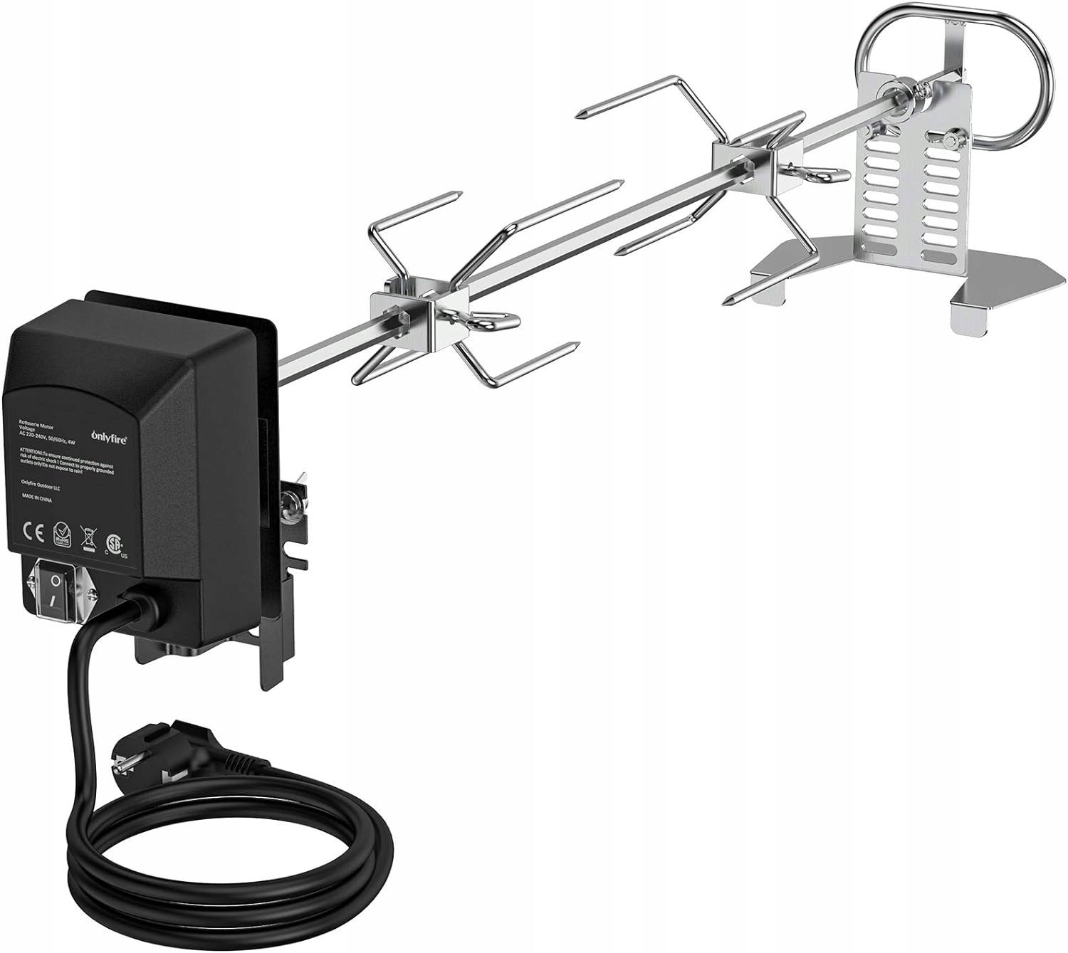 Silnik o napięciu 220V-240V z funkcją automatycznego cofania obraca ładunki do 15 kg. Dzięki wodoodpornemu włącznikowi, grillowanie nigdy nie było tak proste i przyjemne.