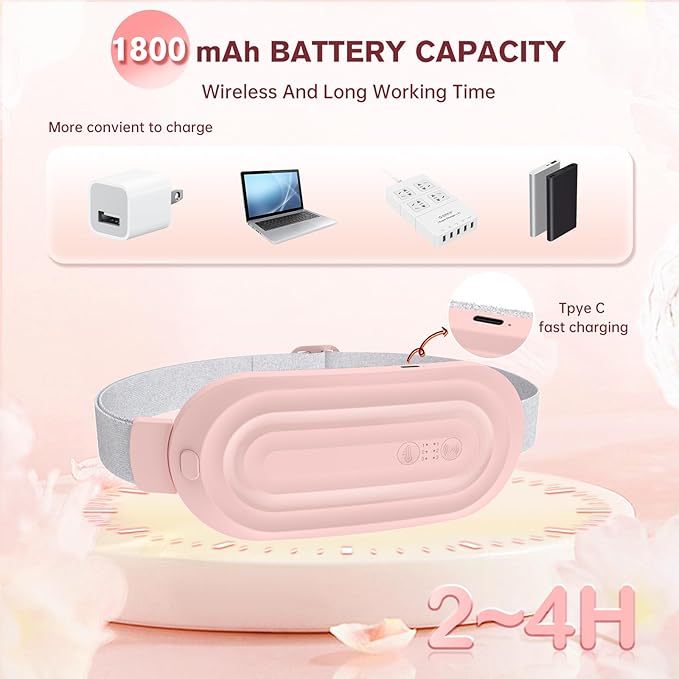 Przenośny i ładowany przez USB: Pas do masażu i ciepła waży około 150 g. Jest lekki i łatwy do przenoszenia. Włóż go do torby lub walizki, gdy wychodzisz, nie zajmuje miejsca. Podkładka grzewcza może być ładowana przez port USB komputera lub powerbanku. Po pełnym naładowaniu może być używany do 2-3 godzin. Możesz użyć urządzenia łagodzącego skurcze miesiączkowe, aby złagodzić ból w dowolnym miejscu i czasie.