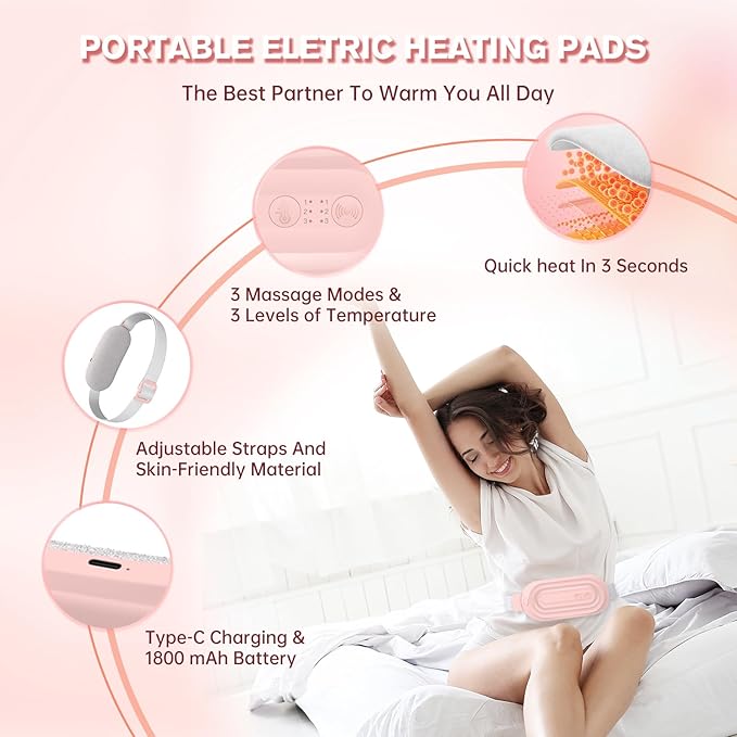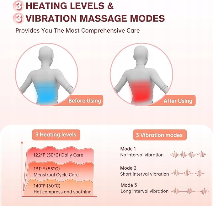 Regulowana temperatura i poziomy masażu: poduszka grzewcza ma 3 regulowane poziomy temperatury: 50/55/60°C. 50°C dla codziennego ciepłego brzucha, 55°C do pielęgnacji menstruacyjnej i 60°C dla złagodzenia bolesnego miesiączkowania. Posiada 3 tryby masażu: niska/średnia/wysoka częstotliwość. Możesz ustawić odpowiedni tryb temperatury i wibracji w zależności od różnych stanów i potrzeb, aby lepiej złagodzić ból menstruacyjny.
