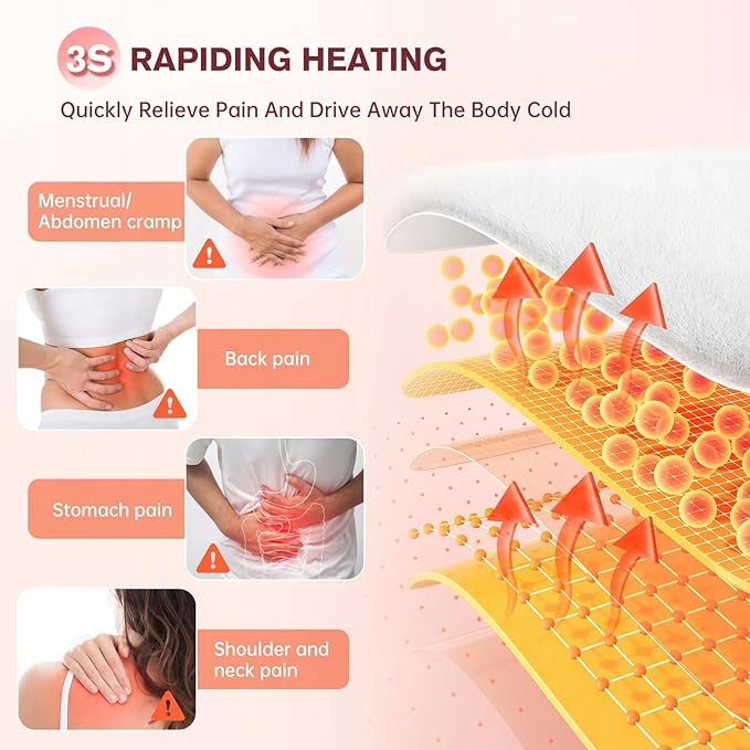 Szybka menstruacyjna podkładka grzewcza na 3 sekundy - nasz pas biodrowy wykorzystuje technologię ogrzewania grafenowego. Po włączeniu urządzenia szybko się nagrzewa. Szybko się nagrzewa w ciągu 3-6 sekund, skutecznie chroni przed zimnem i łagodzi ból menstruacyjny u kobiet i skurcze. Uważaj na oparzenia. Należy nosić z ubraniami. Nie dotykaj bezpośrednio skóry