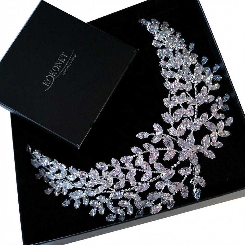 Opaska ślubna z cyrkoniami i kryształkami stanowić będzie pięknie uzupełnienie fryzury w której będziesz stawiać na blask. Połyskujące cyrkonie będą pięknie wyglądać w wieczorowym świetle.