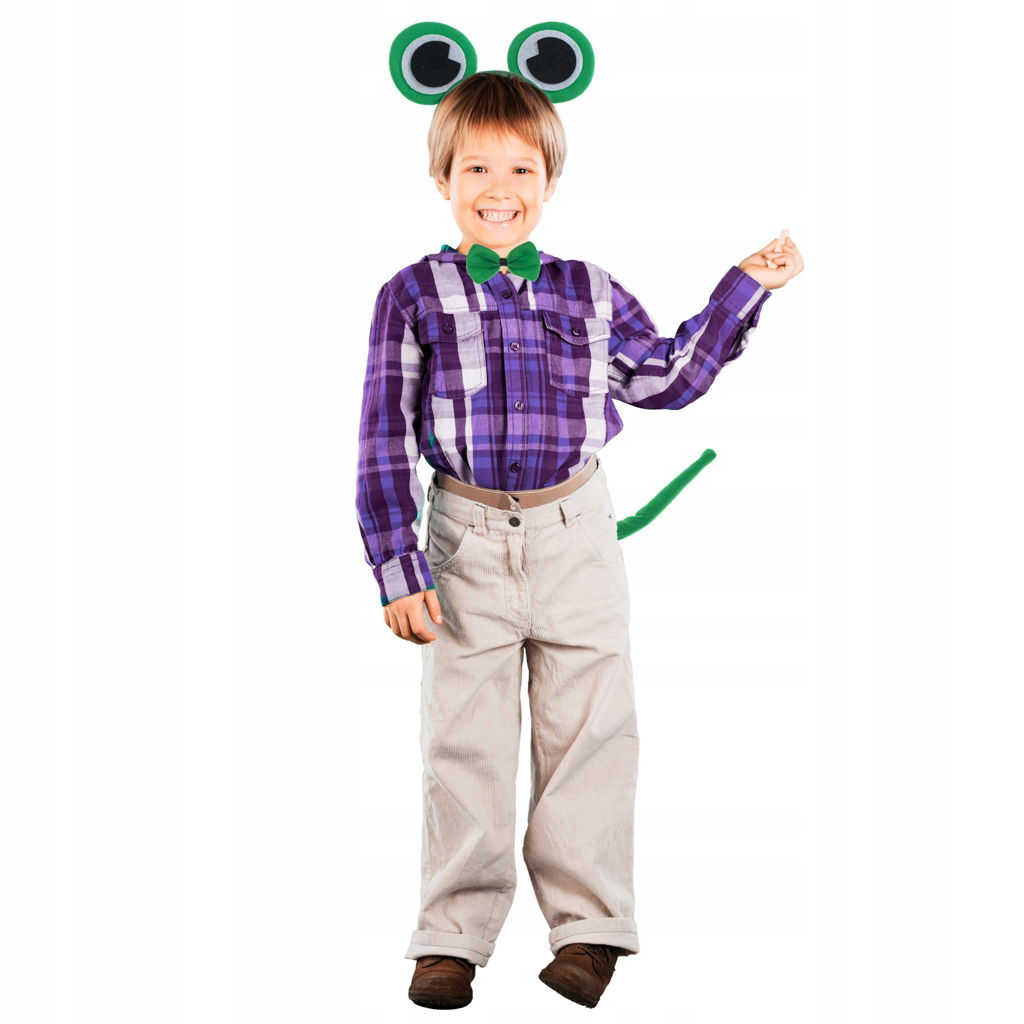 W zestawie znajdziesz zieloną opaskę z oczkami, zieloną muszkę i zielony ogonek. Każdy na imprezie z pewnością będzie wiedział, za kogo przebrał się Twój maluch – uroczą żabkę!