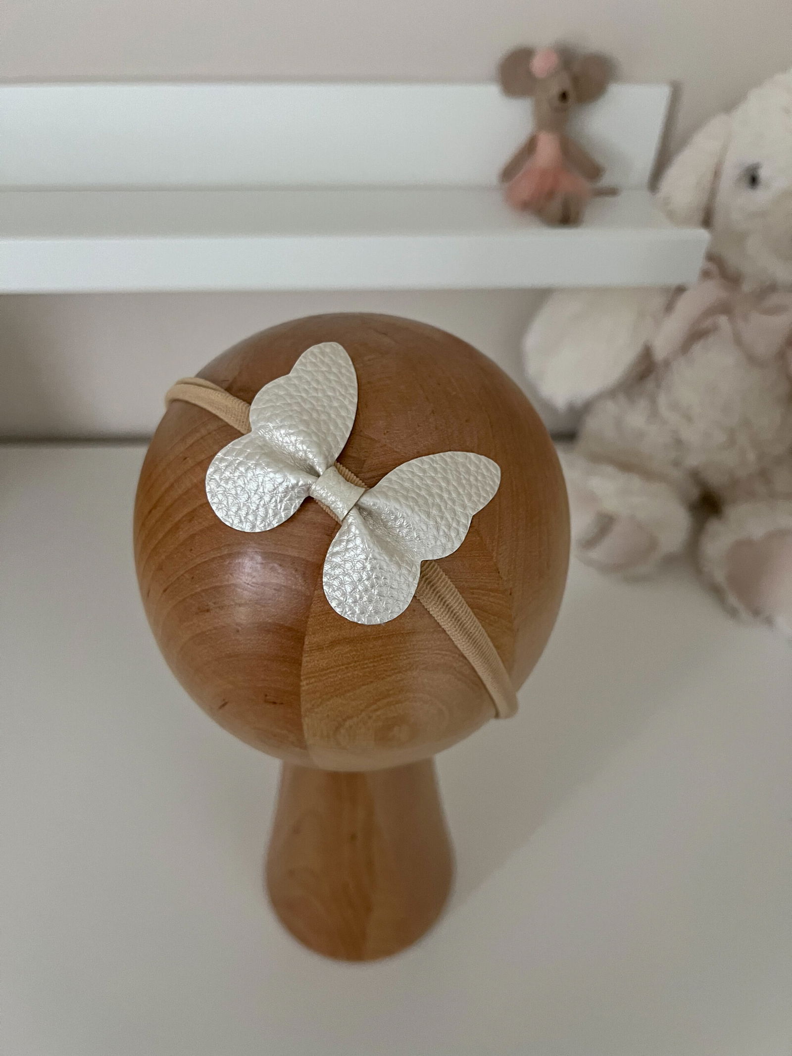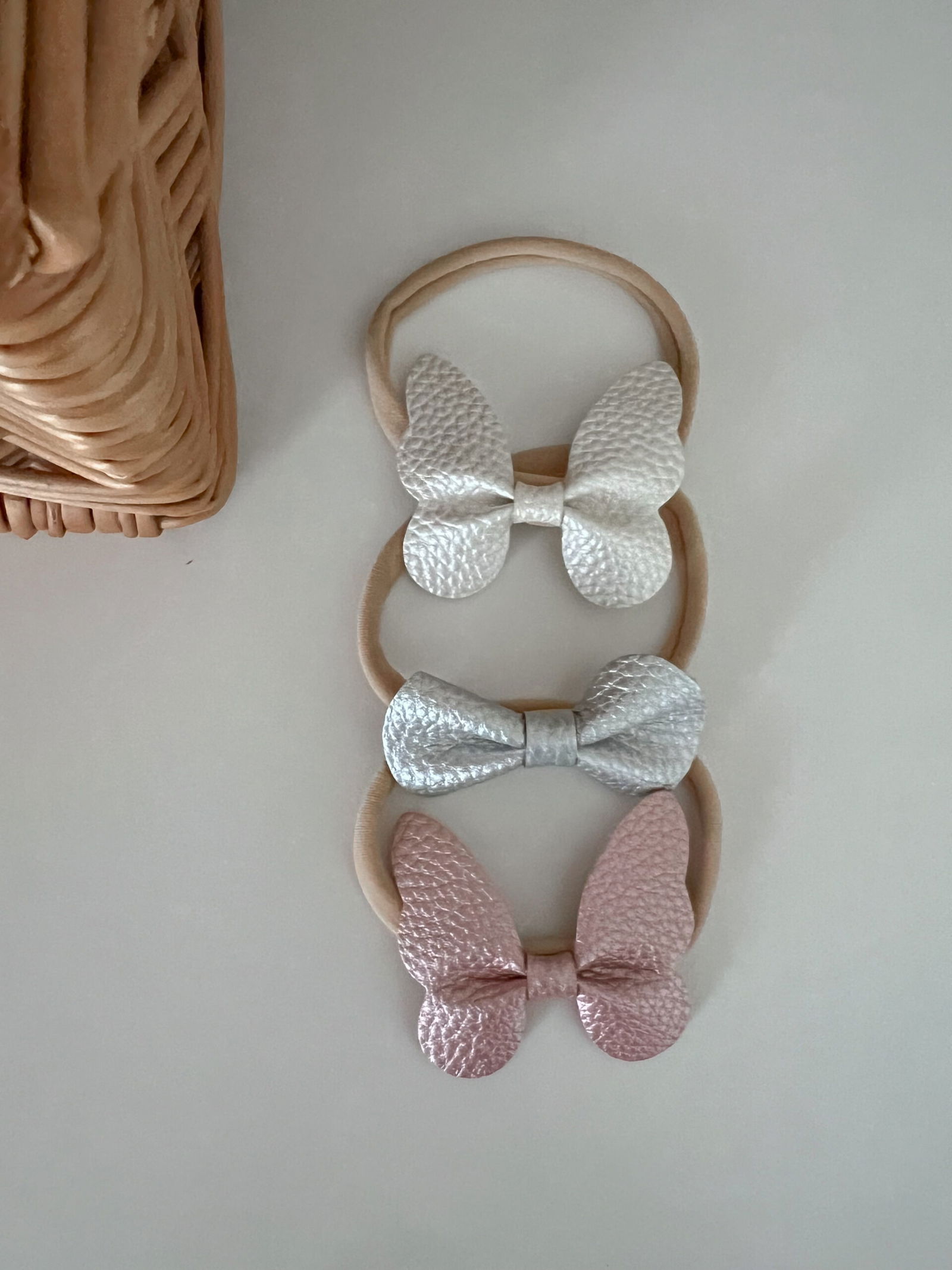 Dwie z opasek zdobią urocze motylki, natomiast jedna ozdobiona jest uroczą kokardką. Elementy ozdobne skradają uwagę swoimi połyskującymi metalicznymi kolorami: perłowym, brudnym różem i srebrnym. Dzięki temu zestawowi opasek, Twoje dziecko będzie miało doskonałe akcesorium do każdej dziecięcej stylizacji przez cały rok.