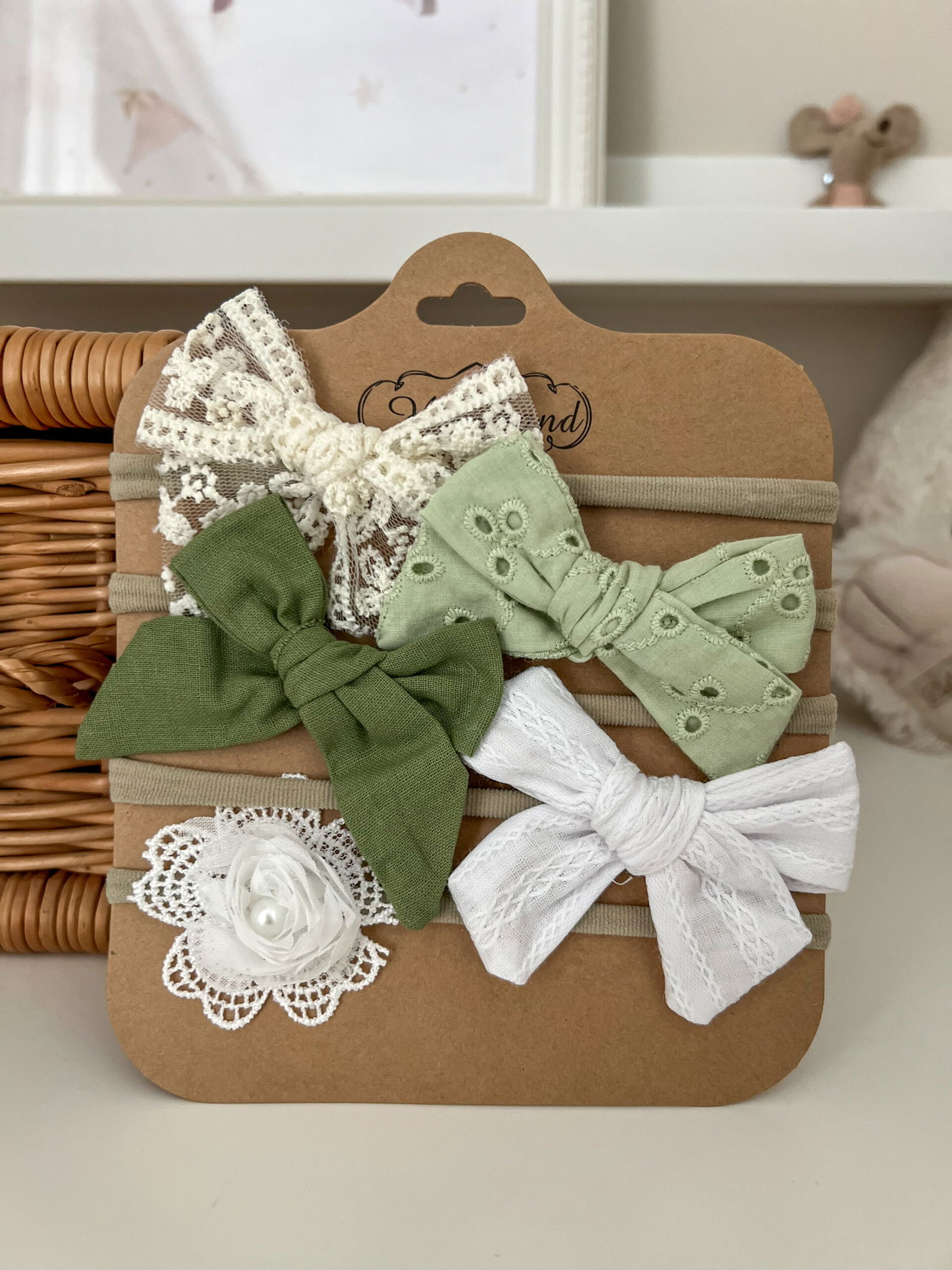 Zestaw Green to pięć ozdobnych opasek bezuciskowych wykonanych z tkaniny konopnej. Opaski bezuciskowe charakteruzują się wygodą w noszeniu i dopasowaniem do dość szerokiego zakresu wieku dziewczynki. Będą pasowały na maluszka już od pierwszych miesięcy życia. Zestaw zawiera opaski z motywem kokardek oraz kwiatuszkaw. Paleta kolorystyczna to odcienie zieleni, biel i krem. Każda z opasek znajdzie swoje zastsowanie podczas sesji zdjęciowych, czy innych wyjątkowych okoliczności. Białe opaski i kremowa koronkowa świetnie dopasują się do stylizacji na chrzest święty.