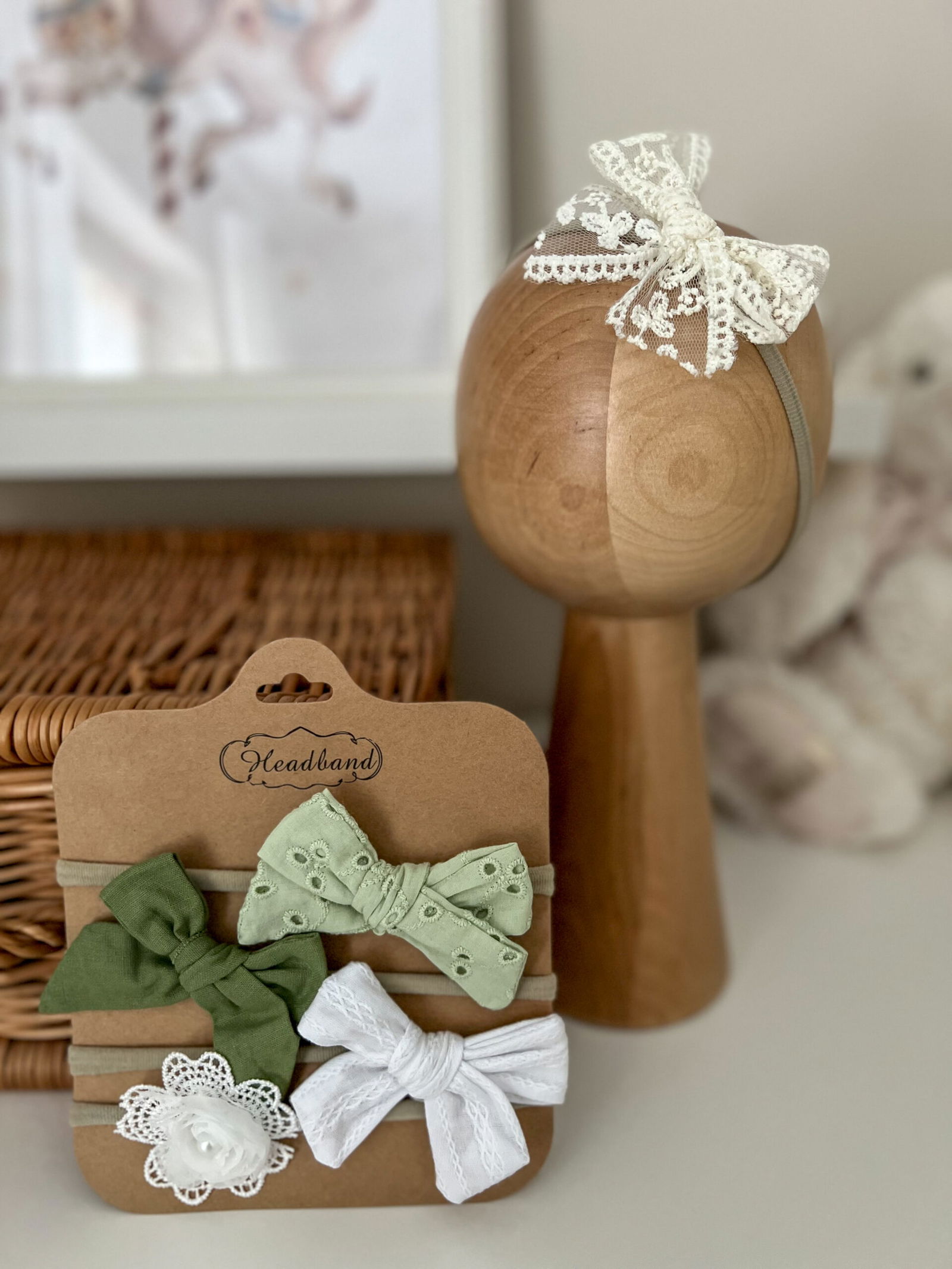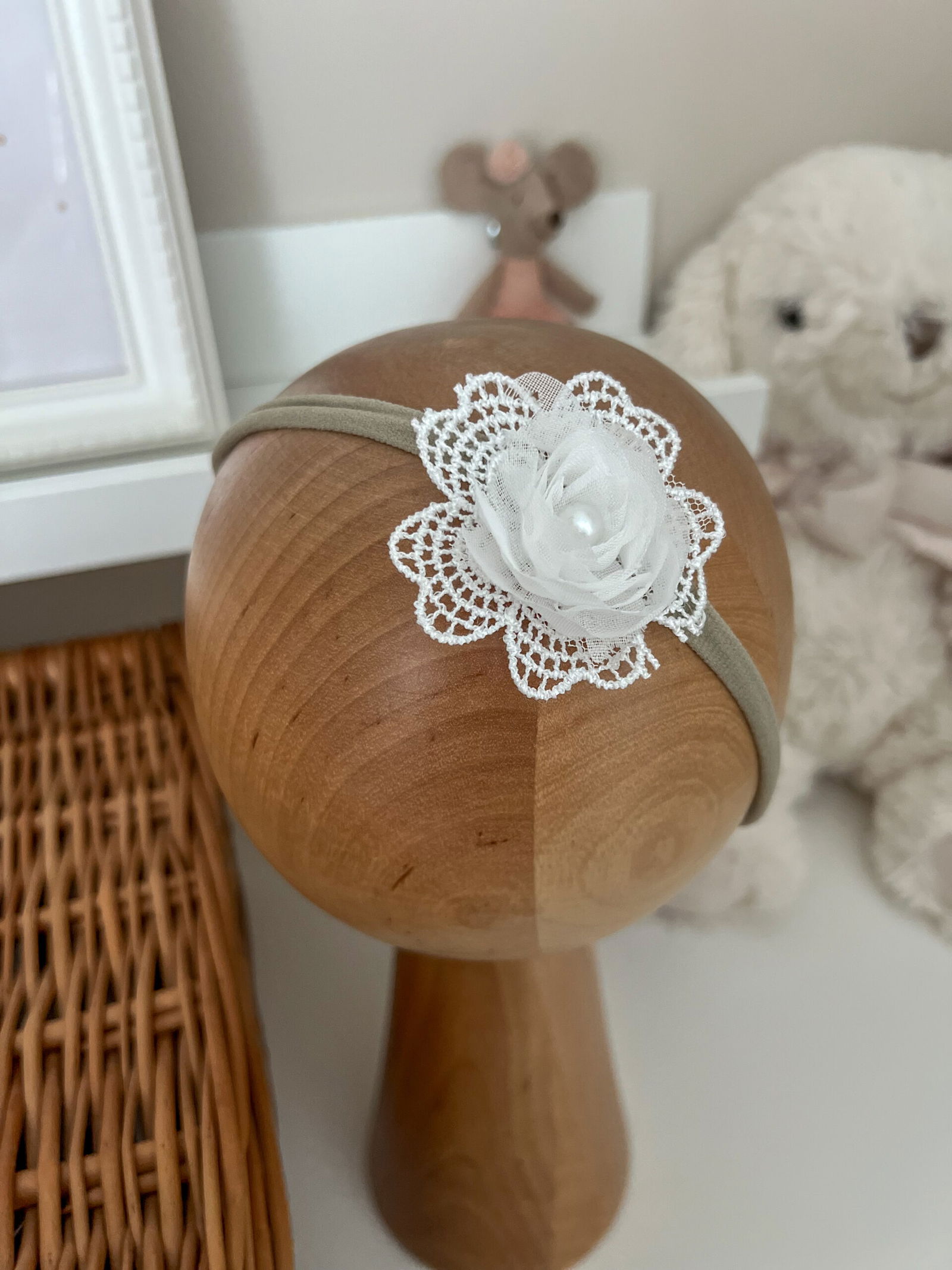 Rozmiar: Drewniana główka prezentująca ma obwód 42 cm co odpowiada standardowo rozmiarowi dla dziecka 3-6 mc. Opaska jest jednak elastyczna i pasuje nawet na 3-latkę.
