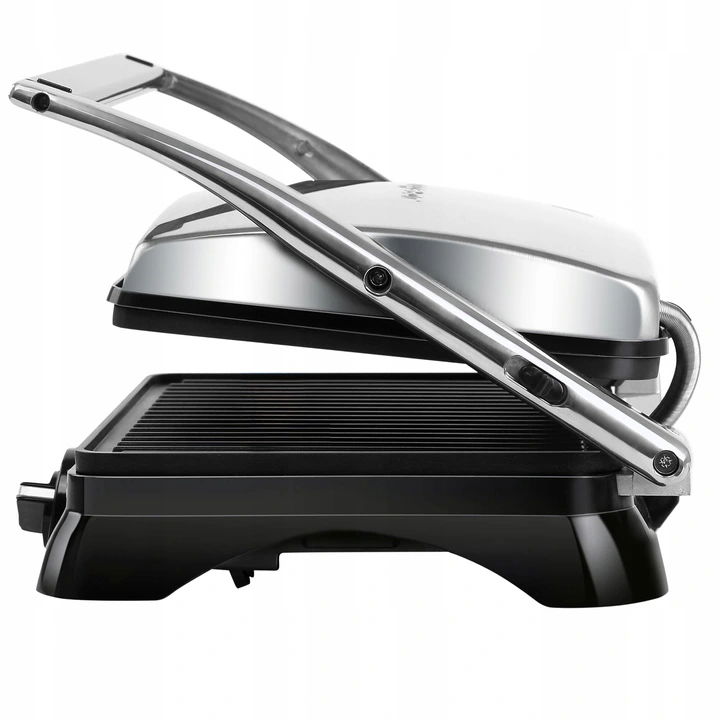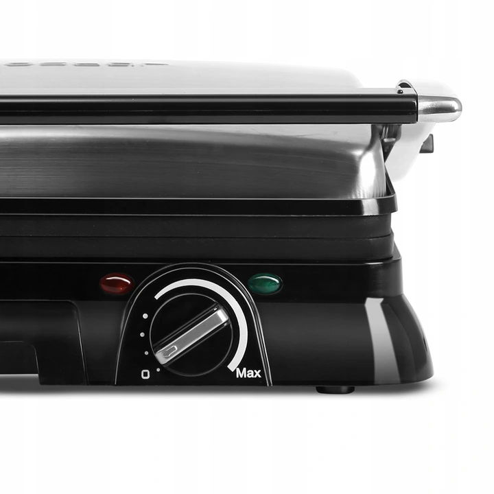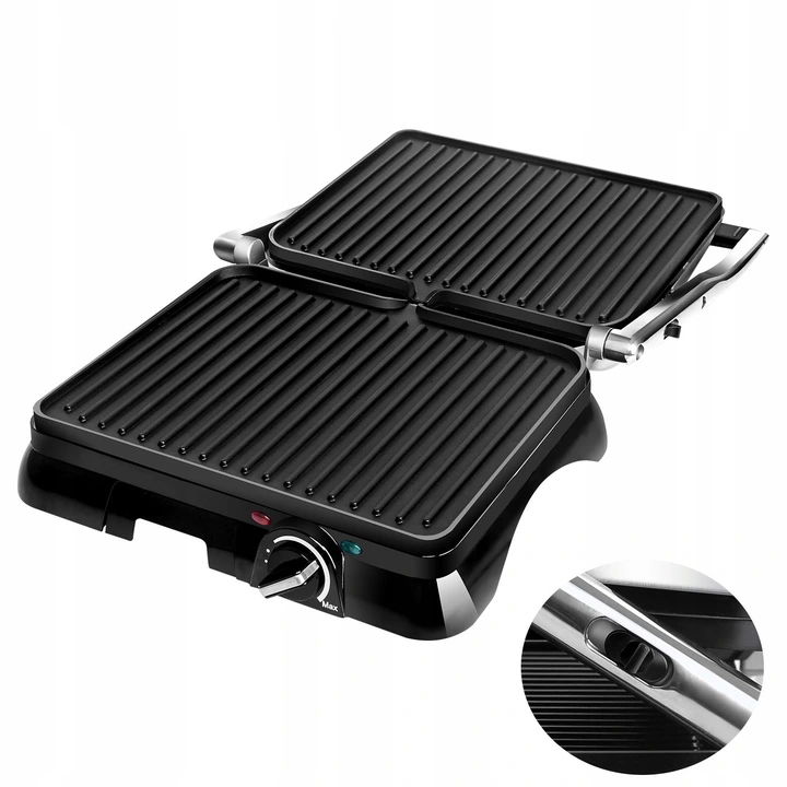 - Dwustronne opiekanie i otwieranie do 180° – równomierne podgrzewanie i możliwość używania jak klasycznego grilla stołowego.