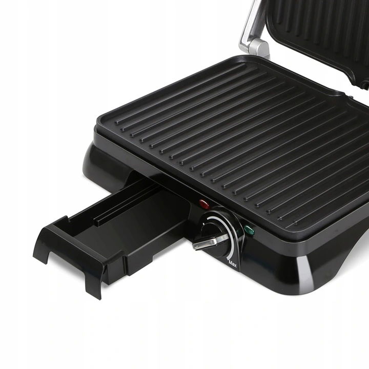 - Funkcje dodatkowe: otwieranie 180°, lampki kontrolne, tacka na tłuszcz