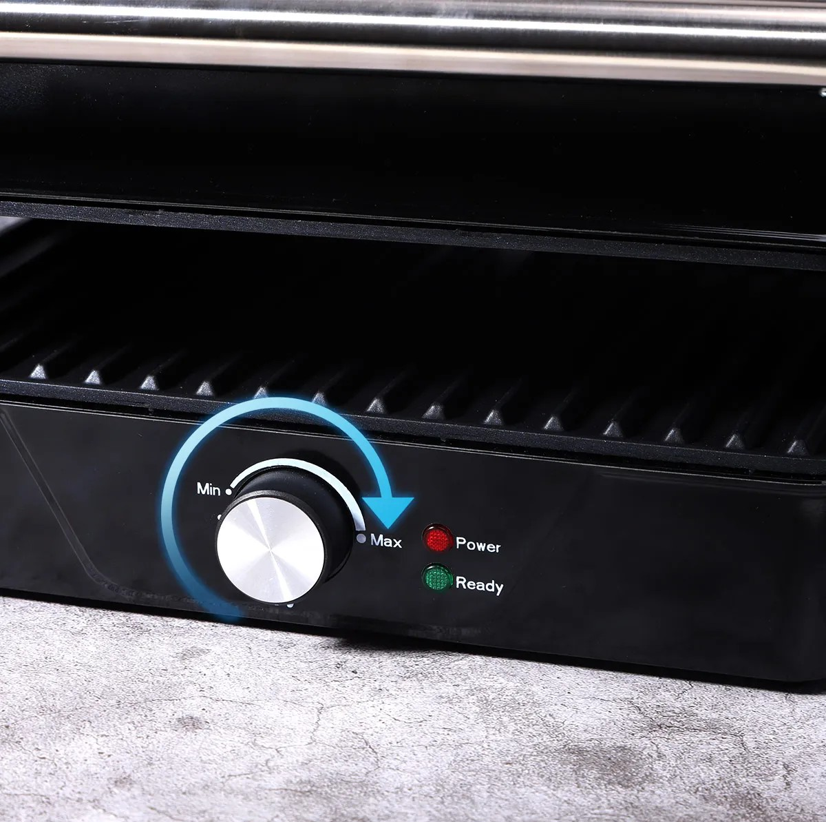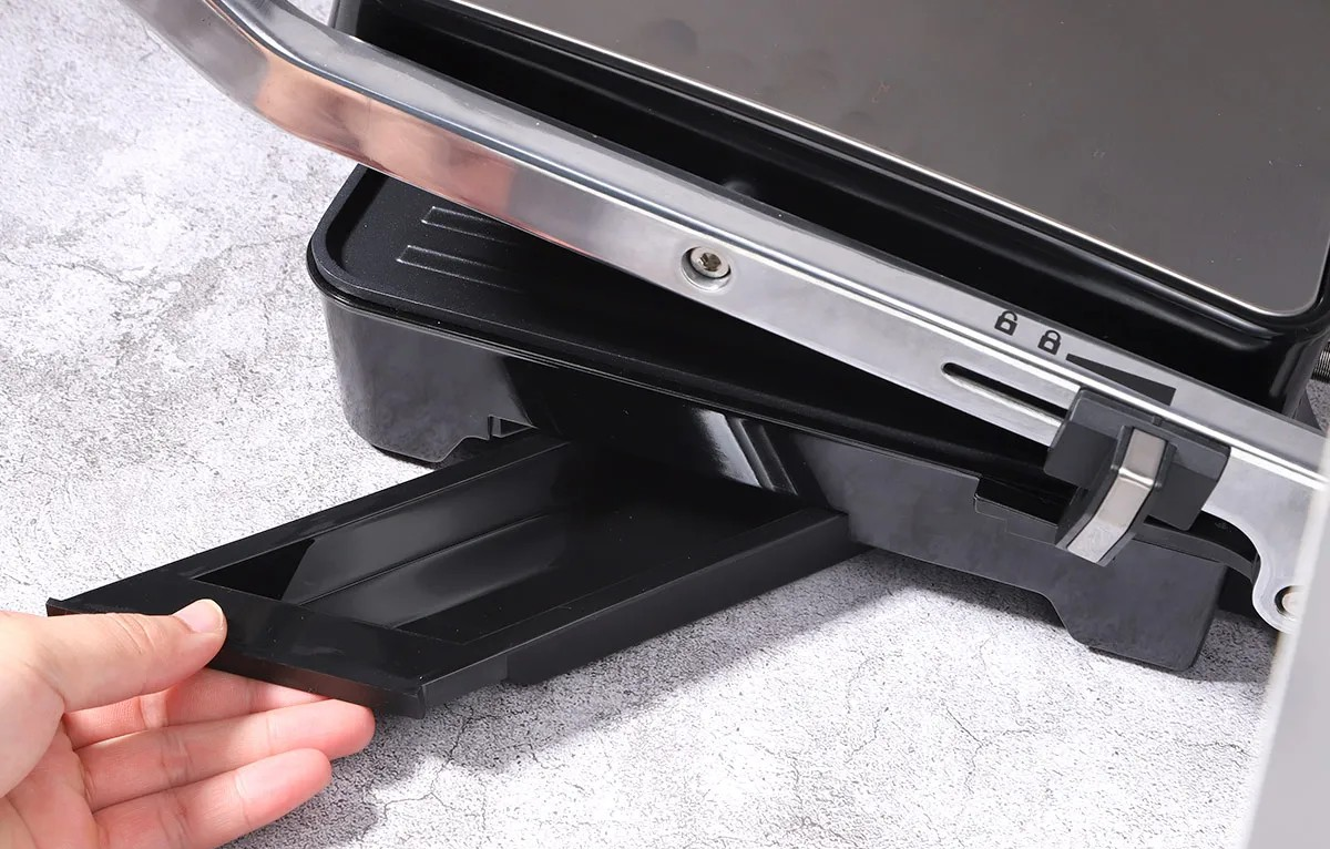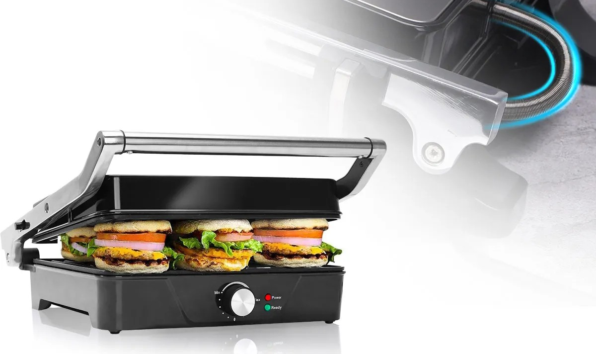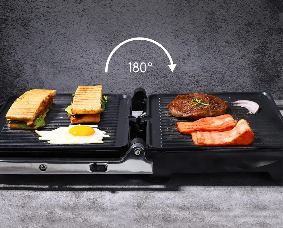 Płyty grzewcze mają rozwartość 180°;Obudowa Ze Stali Nierdzewnej;Nieprzywierająca powłoka grillująca;Regulowany termostat;Odpinana tacka na zacieki;Lampka kontrolna