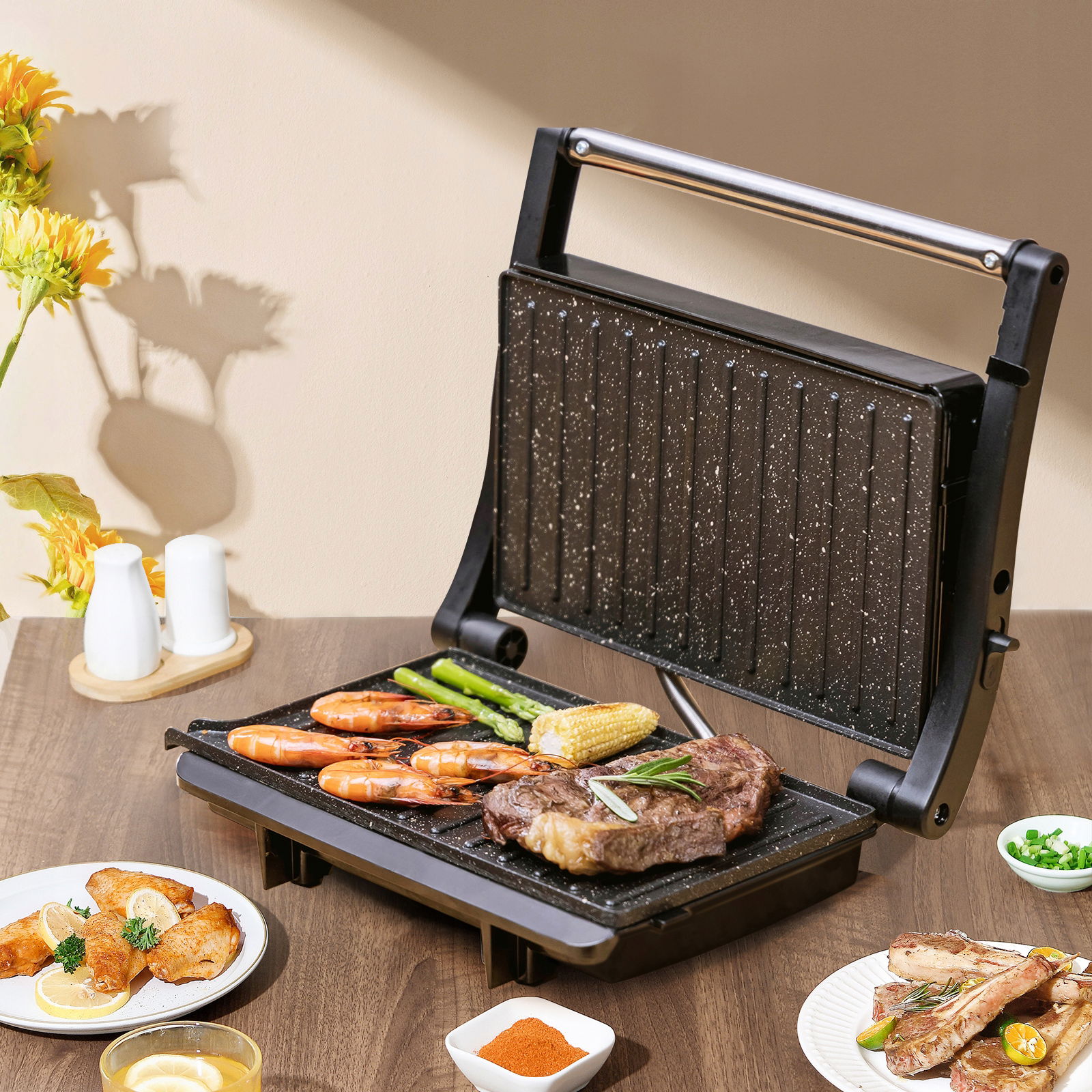• Możliwość otwarcia 180° – większa powierzchnia i wygoda smażenia