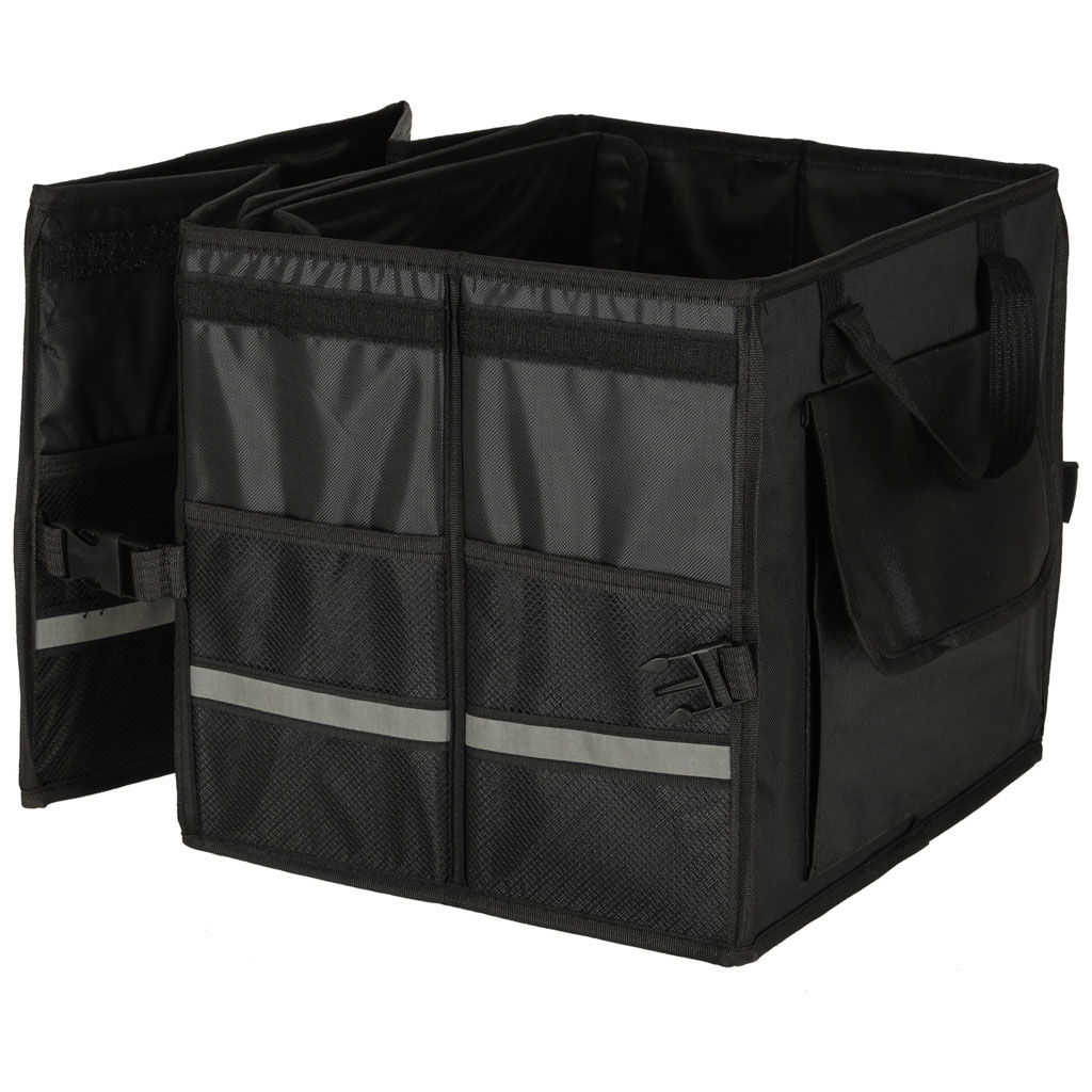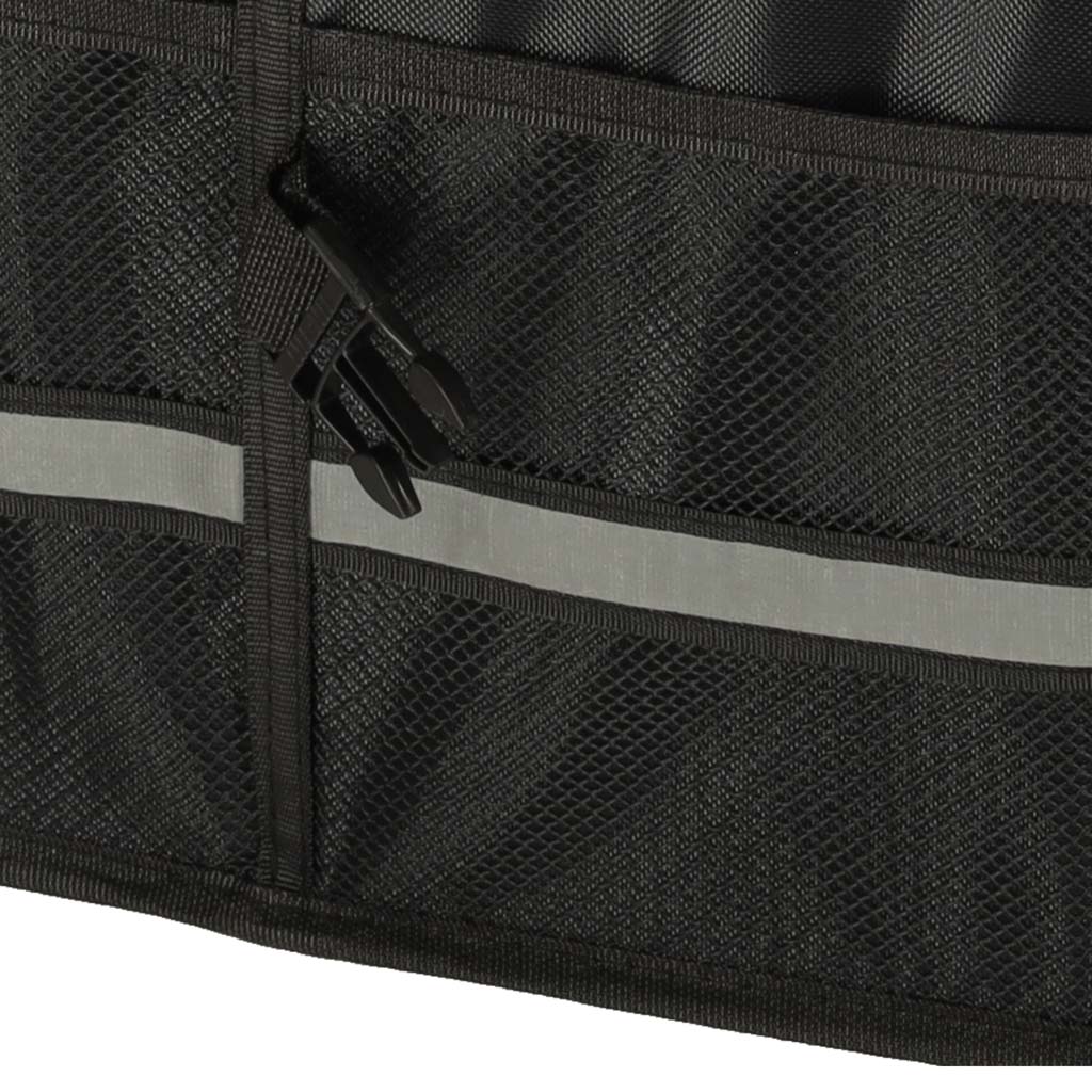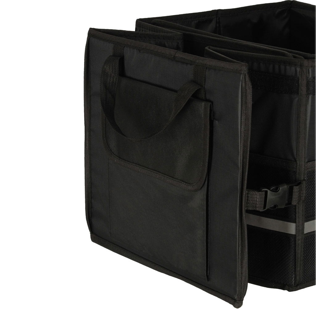 WIDOCZNOŚĆ I KOMFORT UŻYTKOWANIA - Elementem wyróżniającym jest odblaskowa taśma, która poprawia widoczność torby po zmroku, a także ułatwia jej znalezienie w ciemnym bagażniku. Organizer wykonano z mocnej tkaniny Oxford odpornej na uszkodzenia, a dzięki klamrom bocznym można go łatwo skompresować i przechować, gdy nie jest używany. Rączki z taśmy zapewniają wygodne przenoszenie.