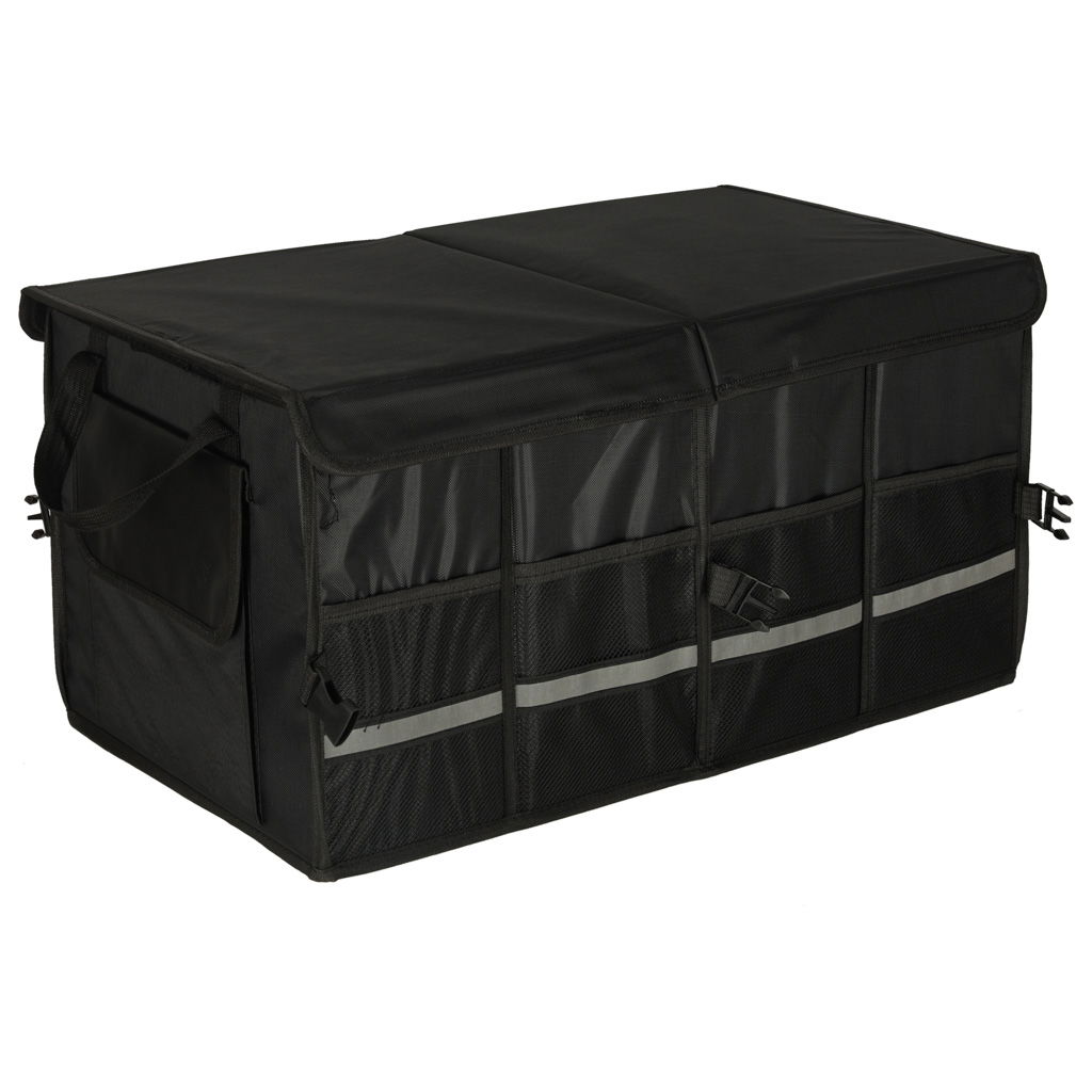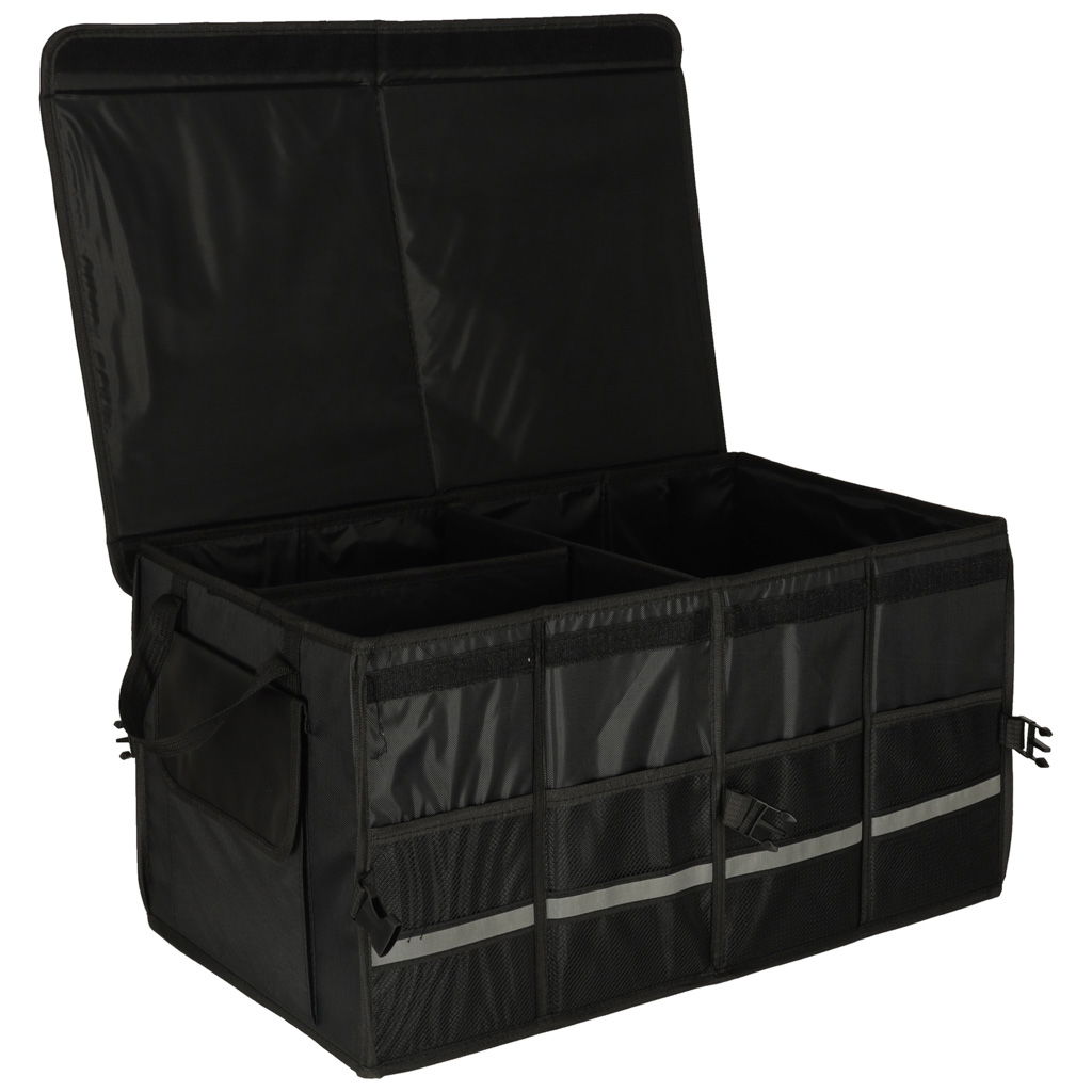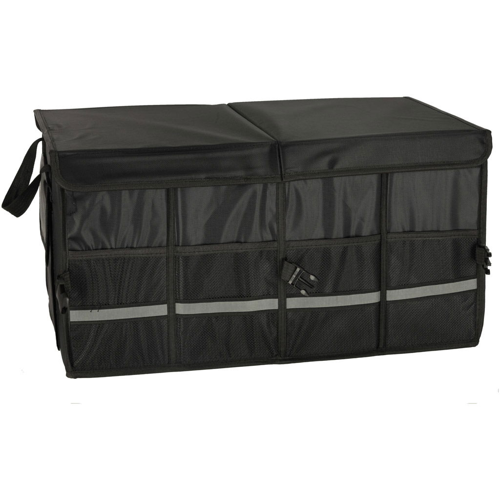 WIDOCZNOŚĆ I KOMFORT UŻYTKOWANIA - Elementem wyróżniającym jest odblaskowa taśma, która poprawia widoczność torby po zmroku, a także ułatwia jej znalezienie w ciemnym bagażniku. Organizer wykonano z mocnej tkaniny Oxford odpornej na uszkodzenia, a dzięki klamrom bocznym można go łatwo skompresować i przechować, gdy nie jest używany. Rączki z taśmy zapewniają wygodne przenoszenie.
