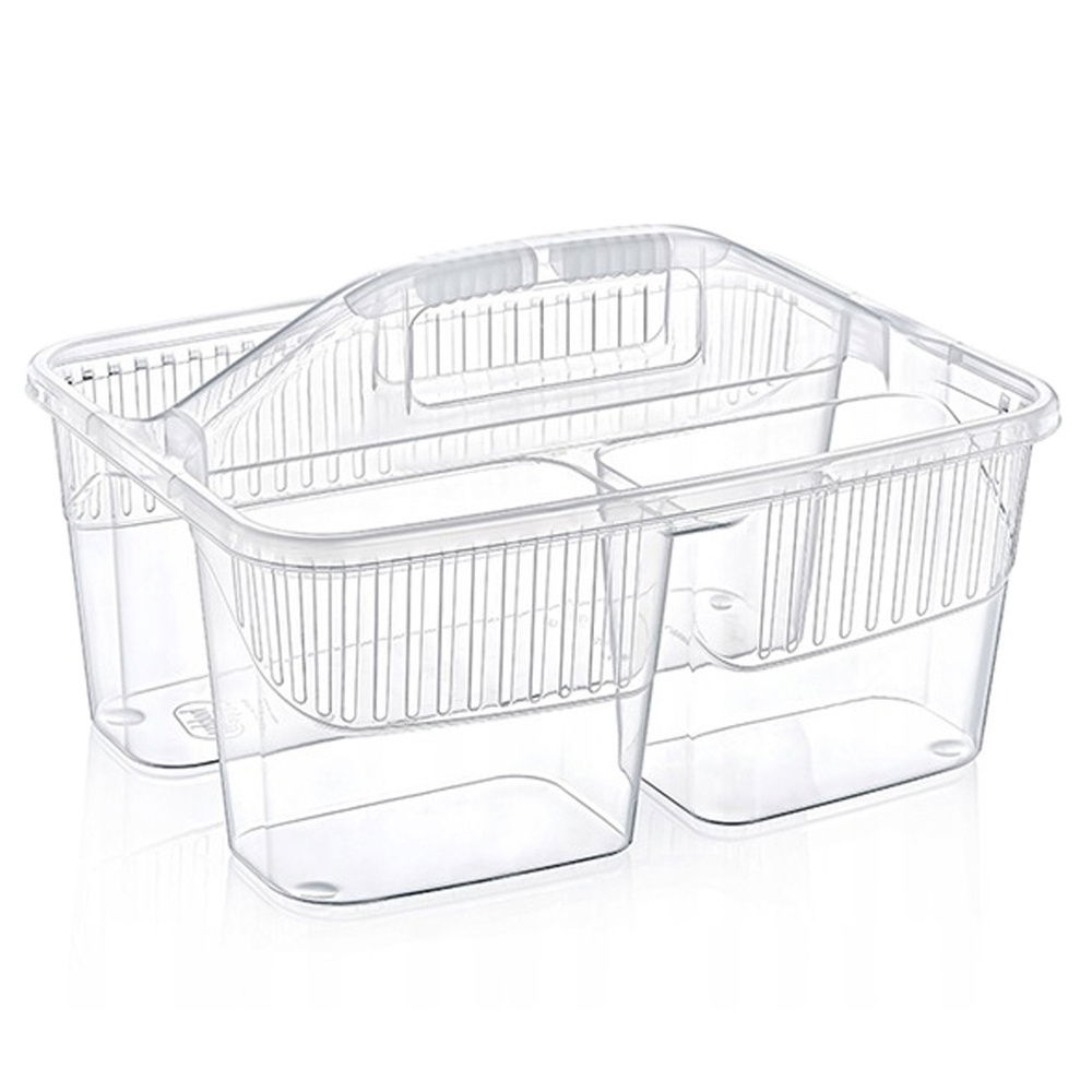 PRAKTYCZNY - Dzielony koszyk do przechowywania oraz przenoszenia środków czystości. Organizer ma wymiary: 30 x 22,5 x 18 cm.