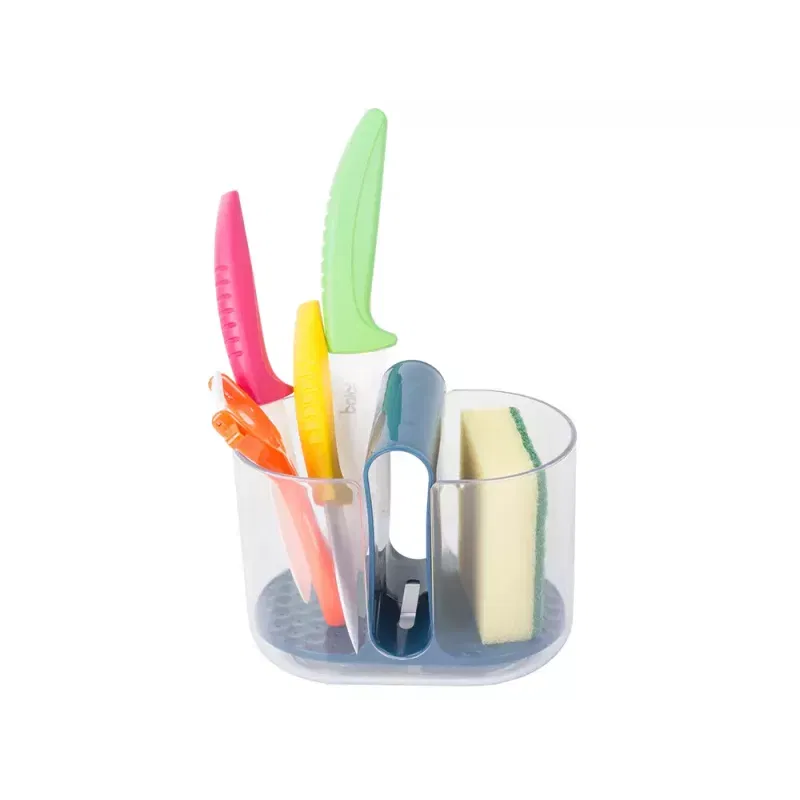 Organizer na sztućce pomoże nam w uporządkowaniu sztućców zaraz po ich umyciu. Jego główna komora jest podzielona na dwie części, co pozwala na grupowanie podobnych rzeczy w trakcie suszenia.Boczne komory przeznaczone są na sztućce, a środkowa na zmywak. Tacka ociekacza posiada otwory dzięki,