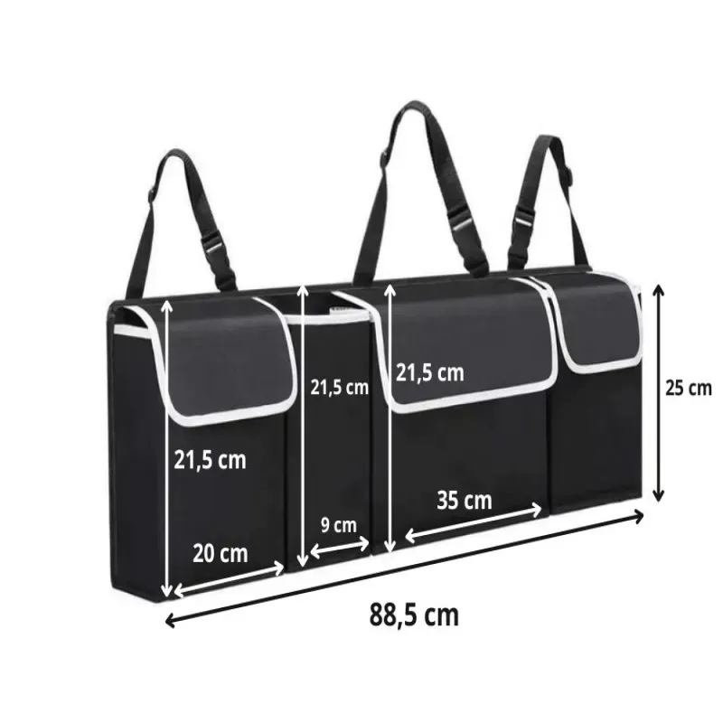 Organizer wyposażony jest w regulowane paski z klamrami, które pozwalają solidnie przymocować go do oparcia tylnej kanapy lub innych elementów w bagażniku. Montaż jest szybki i nie wymaga użycia narzędzi.