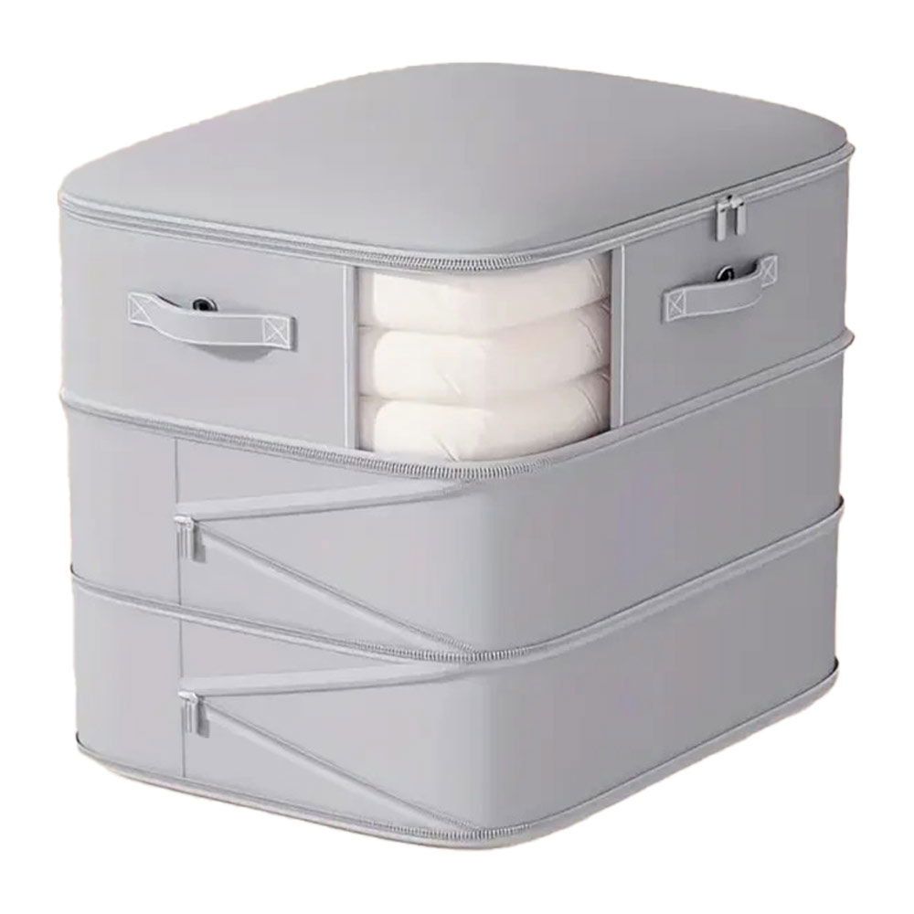 Dzięki przemyślanej konstrukcji i zastosowaniu miękkiego, ale wytrzymałego materiału, organizer chroni przechowywane rzeczy przed kurzem, zagnieceniami i zabrudzeniem. Góra zapinana na suwak pozwala szybko zapakować koce, kołdry, swetry czy dziecięce ubranka, a po wypełnieniu torba samoczynnie kompresuje zawartość, zmniejszając jej objętość nawet o 40% - bez użycia odkurzacza.